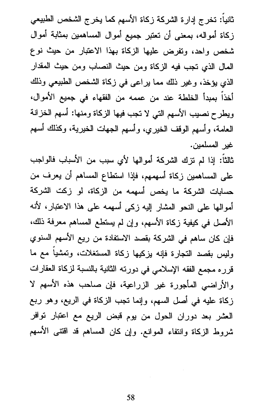 ثانياً: تخرج إدارة الشركة زكاة الأسهم كما يخرج الشخص الطبيعي زكاة أمواله، بمعنى أن تعتبر جميع أموال المساهمين بمثابة أموال شخص واحد، وتفرض عليها الزكاة بهذا الاعتبار من حيث نوع المال الذي تجب فيه الزكاة ومن حيث النصاب ومن حيث المقدار الذي يؤخذ، وغير ذلك مما يراعى في زكاة الشخص الطبيعي وذلك أخذاً بمبدأ الخلطة عند من عممه من الفقهاء في جميع الأموال، ويطرح نصيب الأسهم التي لا تجب فيها الزكاة ومنها: أسهم الخزانة العامة، وأسهم الوقف الخيري، وأسهم الجهات الخيرية، وكذلك أسهم غير المسلمين.
