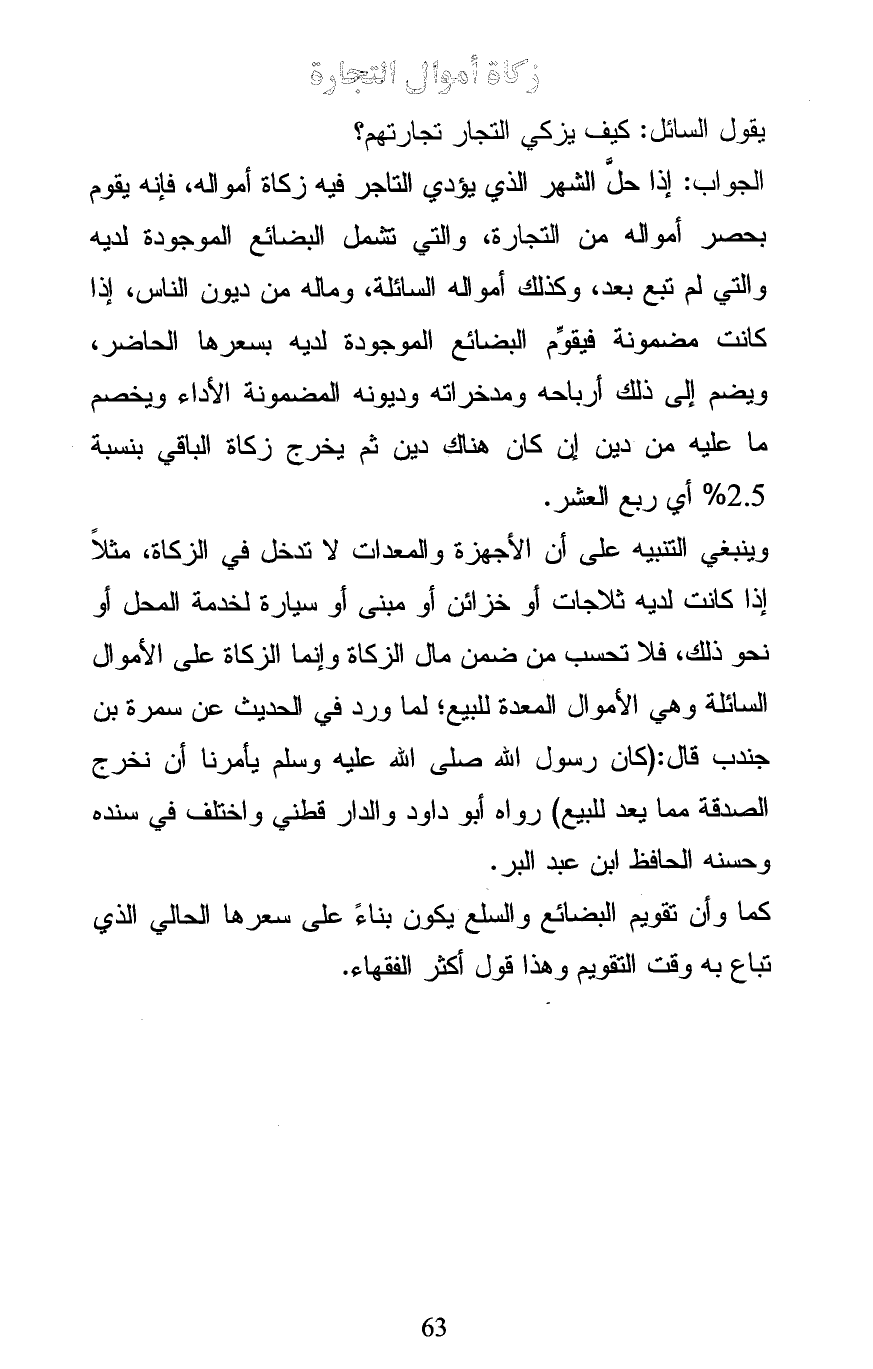 الجواب: إذا حلَّ الشهر الذي يؤدي التاجر فيه زكاة أمواله، فإنه يقوم بحصر أمواله من التجارة، والتي تشمل البضائع الموجودة لديه والتي لم تبع بعد، وكذلك أمواله السائلة، وماله من ديون الناس، إذا كانت مضمونة فيقوِّم البضائع الموجودة لديه بسعرها الحاضر، ويضم إلى ذلك أرباحه ومدخراته وديونه المضمونة الأداء ويخصم ما عليه من دين إن كان هناك دين ثم يخرج زكاة الباقي بنسبة 2. 5% أي ربع العشر.