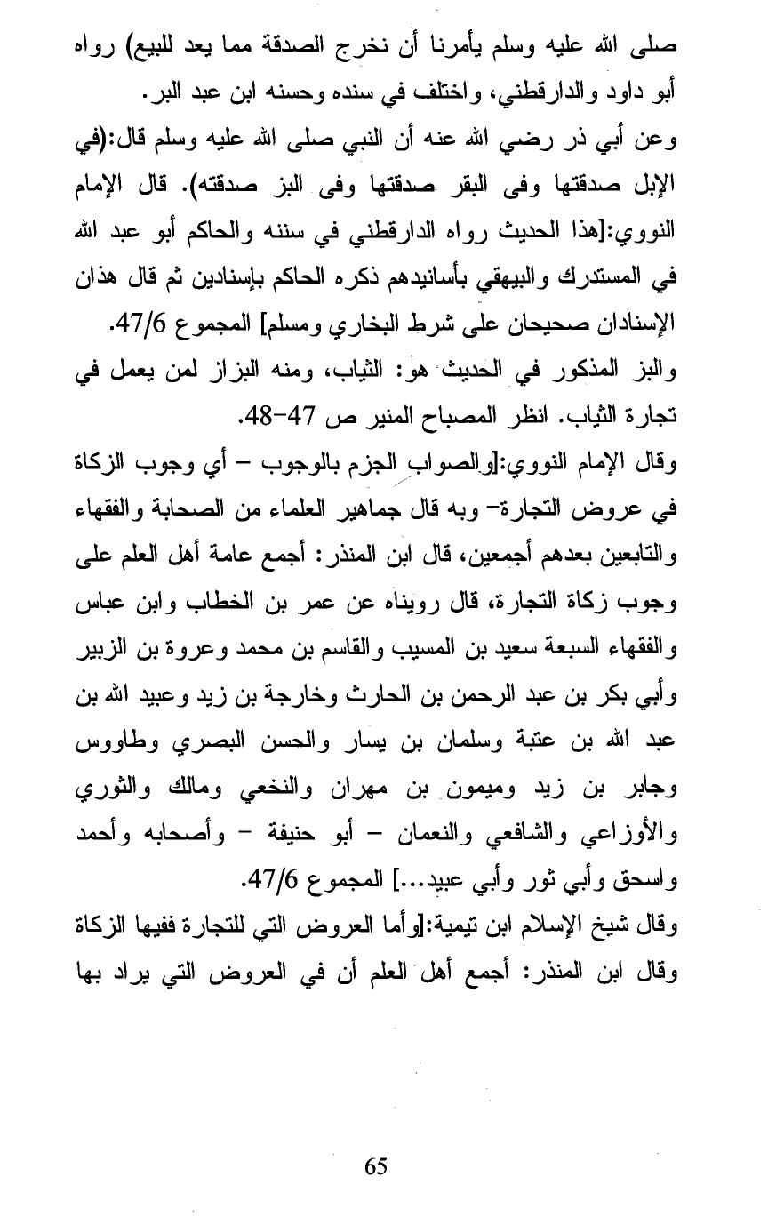 وعن أبي ذر رضي الله عنه أن النبي صلى الله عليه وسلم قال: (في الإبل صدقتها وفى البقر صدقتها وفى البز صدقته). قال الإمام النووي: [هذا الحديث رواه الدارقطني في سننه والحاكم أبو عبد الله في المستدرك والبيهقي بأسانيدهم ذكره الحاكم بإسنادين ثم قال هذان الإسنادان صحيحان على شرط البخاري ومسلم] المجموع 6/ 47.