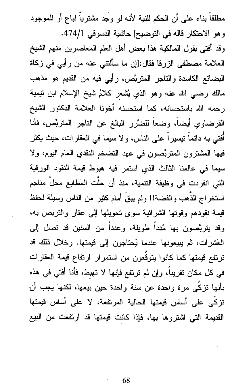 وقد أفتى بقول المالكية هذا بعض أهل العلم المعاصرين منهم الشيخ العلامة مصطفى الزرقا فقال: [إن ما سألتني عنه من رأيي في زكاة البضائع الكاسدة والتاجر المتربِّص، رأيي فيه من القديم هو مذهب مالك رضي الله عنه وهو الذي يُشعِر كلامُ شيخ الإسلام ابن تيمية رحمه الله باستحسانه، كما استحسنه أخونا العلامة الدكتور الشيخ القرضاوي أيضاً، وضعاً للضَّرر البالغ عن التاجر المتربِّص، فأنا أُفتي به دائماً تيسيراً على الناس، ولا سيما في العقارات، حيث يكثر فيها المشترون المتربِّصون في عهد التضخم النقدي العام اليوم، ولا سيما في عالمنا الثالث الذي استمر فيه هبوط قيمة النقود الورقية التي انفردت في وظيفة التنمية، منذ أن حلَّت المَطابع محلَّ مناجم استخراج الذَّهب والفضة!! ولم يبقَ أمام كثير من الناس وسيلة لحفظ قيمة نقودهم وقوتها الشرائية سوى تحويلها إلى عقار والتربص به، وقد يتربَّصون بها مُدداً طويلة، وعدداً من السنين قد تَصل إلى العَشرات، ثم يبيعونها عندما يَحتاجون إلى قيمتها. وخلال ذلك قد ترتفع قيمتها كما كانوا يتوقَّعون من استمرار ارتفاع قيمة العَقارات في كل مكان تقريباً، وإن لم ترتفع فإنها لا تهبِط، فأنا أفتي في هذه بأنها تزكَّى مرة واحدة عن سنة واحدة حين بيعها، لكنها يجب أن تزكّى على أساس قيمتها الحالية المرتفعة، لا على أساس قيمتها القديمة التي اشتروها بها، فإذا كانت قيمتها قد ارتفعت من البيع