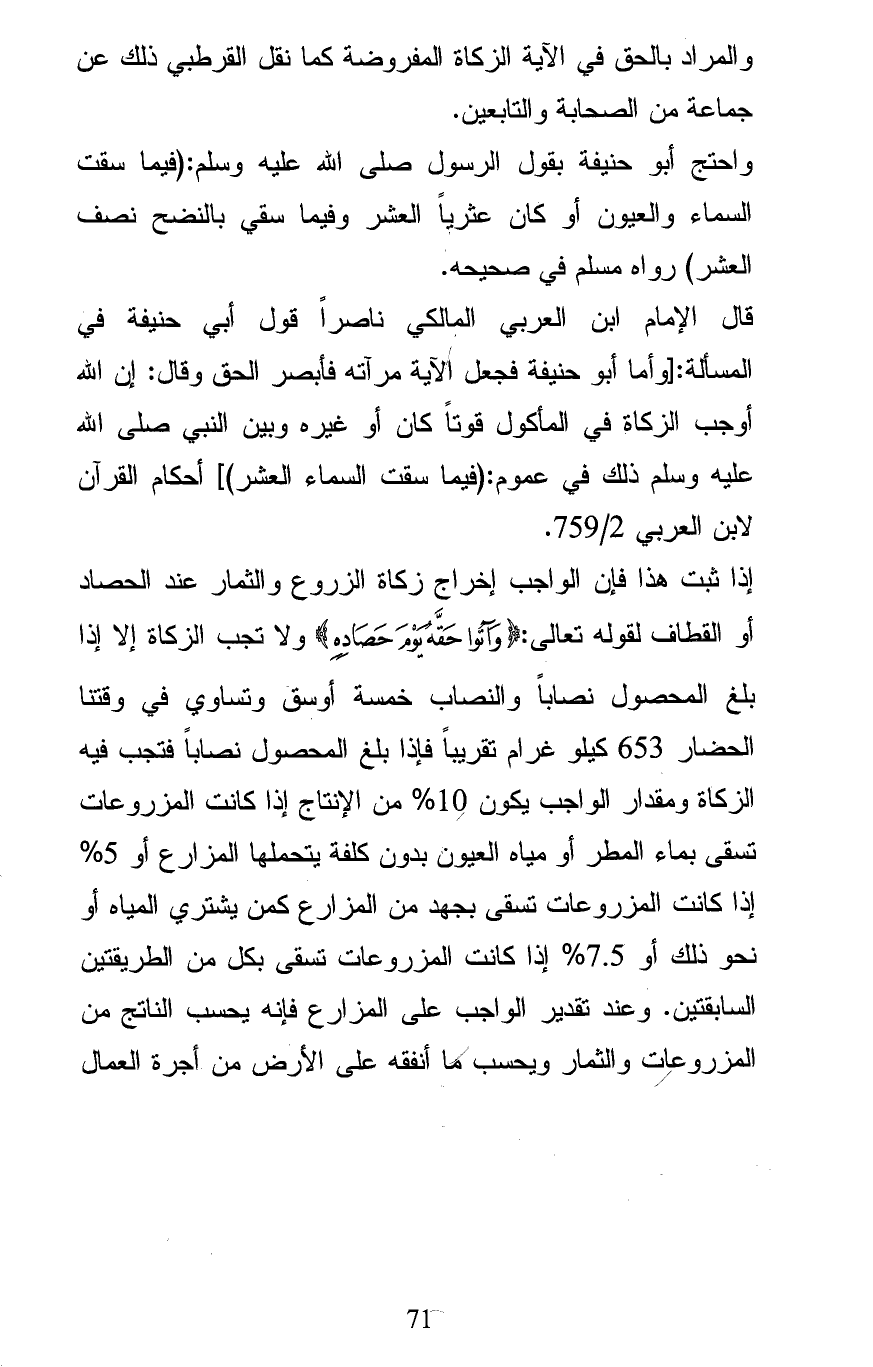 إذا ثبت هذا فإن الواجب إخراج زكاة الزروع والثمار عند الحصاد أو القطاف لقوله تعالى: (وَآتُوا حَقَّهُ يَوْمَ حَصَادِهِ (ولا تجب الزكاة إلا إذا بلغ المحصول نصاباً والنصاب خمسة أوسق وتساوي في وقتنا الحضار 653 كيلو غرام تقريباً فإذا بلغ المحصول نصاباً فتجب فيه الزكاة ومقدار الواجب يكون 10% من الإنتاج إذا كانت المزروعات تسقى بماء المطر أو مياه العيون بدون كلفة يتحملها المزارع أو 5% إذا كانت المزروعات تسقى بجهد من المزارع كمن يشتري المياه أو نحو ذلك أو 7. 5% إذا كانت المزروعات تسقى بكل من الطريقتين السابقتين. وعند تقدير الواجب على المزارع فإنه يحسب الناتج من المزروعات والثمار ويحسب ما أنفقه على الأرض من أجرة العمال