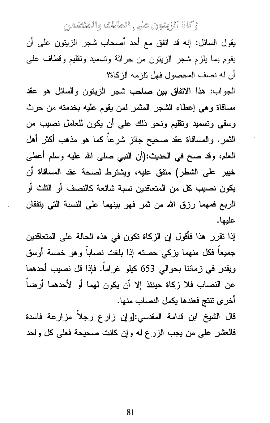 الجواب: هذا الاتفاق بين صاحب شجر الزيتون والسائل هو عقد مساقاة وهي إعطاء الشجر المثمر لمن يقوم عليه بخدمته من حرث وسقي وتسميد وتقليم ونحو ذلك على أن يكون للعامل نصيب من الثمر. والمساقاة عقد صحيح جائز شرعاً كما هو مذهب أكثر أهل العلم، وقد صح في الحديث: (أن النبي صلى الله عليه وسلم أعطى خيبر على الشطر) متفق عليه، ويشترط لصحة عقد المساقاة أن يكون نصيب كل من المتعاقدين نسبة شائعة كالنصف أو الثلث أو الربع فمهما رزق الله من ثمر فهو بينهما على النسبة التي يتفقان عليها.
