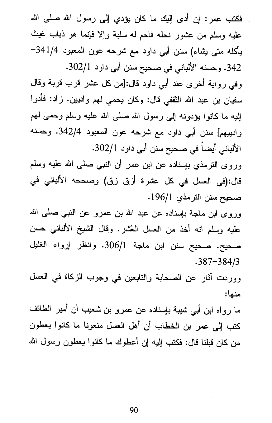 فكتب عمر: إن أدى إليك ما كان يؤدي إلى رسول الله صلى الله عليه وسلم من عشور نحله فاحم له سلبة وإلا فإنما هو ذباب غيث يأكله متى يشاء) سنن أبي داود مع شرحه عون المعبود 4/ 341 - 342. وحسنه الألباني في صحيح سنن أبي داود 1/ 302.
