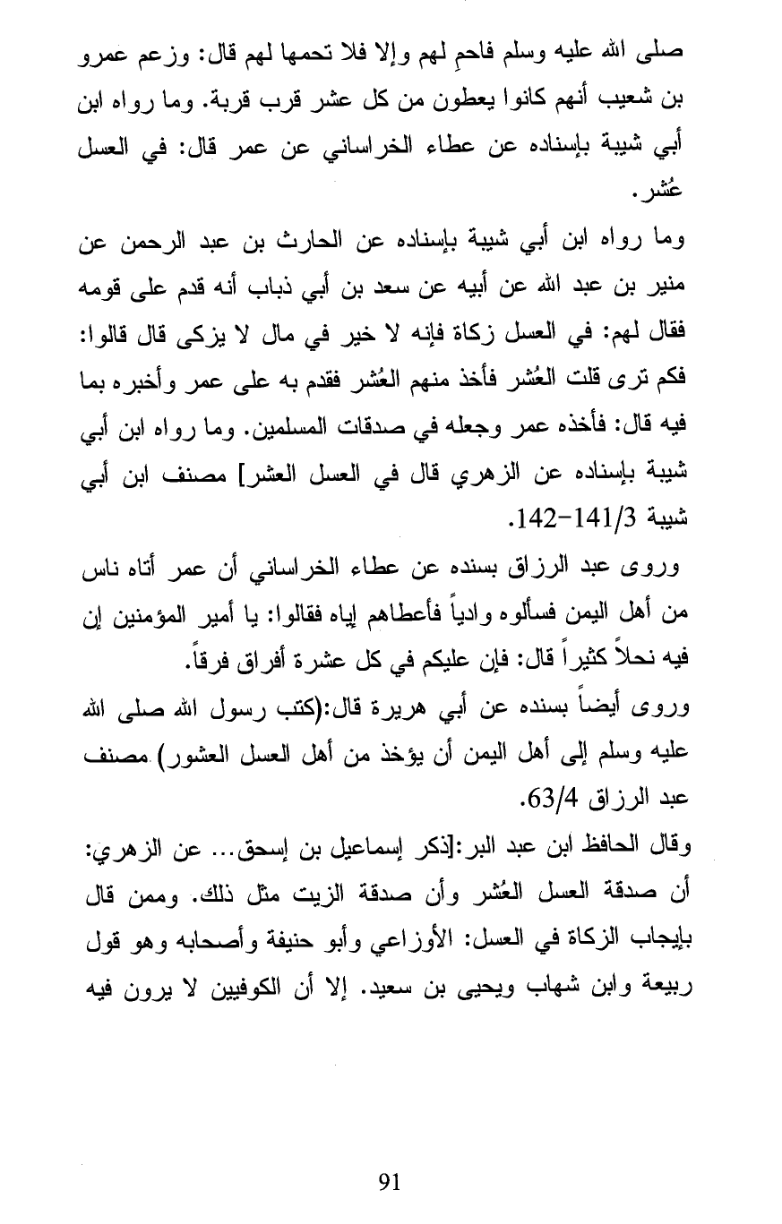 وروى أيضاً بسنده عن أبي هريرة قال: (كتب رسول الله صلى الله عليه وسلم إلى أهل اليمن أن يؤخذ من أهل العسل العشور) مصنف عبد الرزاق 4/ 63.