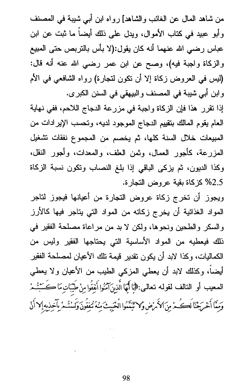 من شاهد المال عن الغائب والشاهد] رواه ابن أبي شيبة في المصنف وأبو عبيد في كتاب الأموال، ويدل على ذلك أيضاً ما ثبت عن ابن عباس رضي الله عنهما أنه كان يقول: (لا بأس بالتربص حتى المبيع والزكاة واجبة فيه)، وصح عن ابن عمر رضي الله عنه أنه قال: (ليس في العروض زكاة إلا أن تكون لتجارة) رواه الشافعي في الأم وابن أبي شيبة في المصنف والبيهقي في السنن الكبرى.