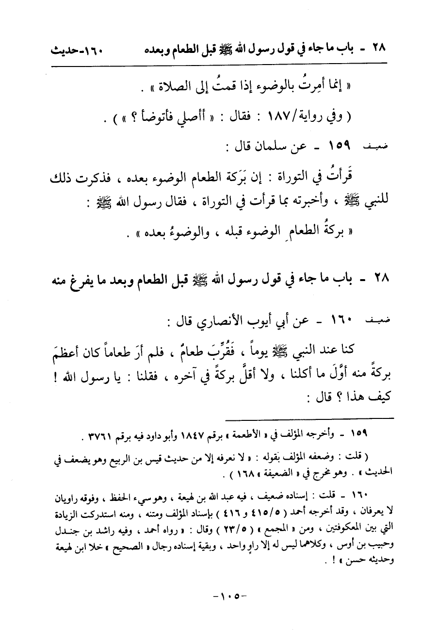 كُنَّا عِنْدَ النَّبِيِّ صَلَّى اللَّهُ عَلَيْهِ وَسَلَّم َ يوما فقرب طعام فَلَمْ أَرَ طَعَامًا كَانَ أَعْظَمَ بَرَكَةً مِنْهُ أَوَّلَ مَا أَكَلْنَا وَلَا أَقَلَّ بَرَكَةً فِي آخِرِهِ فَقُلْنَا: يَا رَسُولَ اللَّهِ كَيْفَ هَذَا؟ قَالَ: