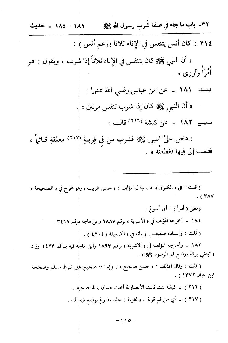 (أن النبي صَلَّى اللَّهُ عَلَيْهِ وَسَلَّم َ دَخَلَ عَلَى أُمِّ سُلَيْمٍ وَقِرْبَةٌ مُعَلَّقَةٌ فَشَرِبَ مِنْ فَمِ الْقِرْبَةِ وَهُوَ قَائِمٌ فَقَامَتْ أُمُّ سُلَيْمٍ إِلَى رأس القربة فقطعتها)