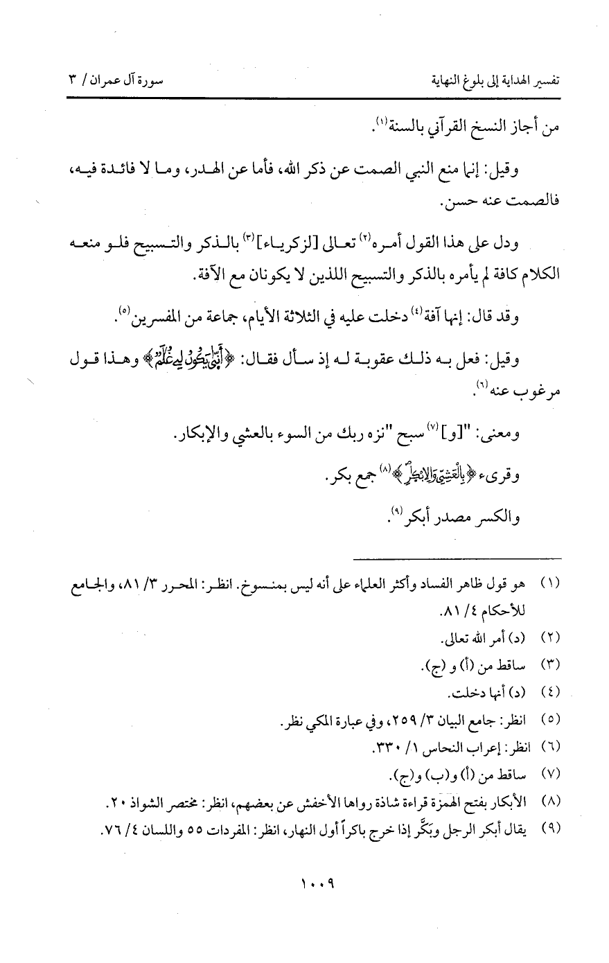 ودل على هذا القول أمره تعالى [زكرياء] بالذكر والتسبيح فلو منعه الكلام كافة لم يأمره بالذكر والتسبيح اللذين لا يكونان مع الآفة.