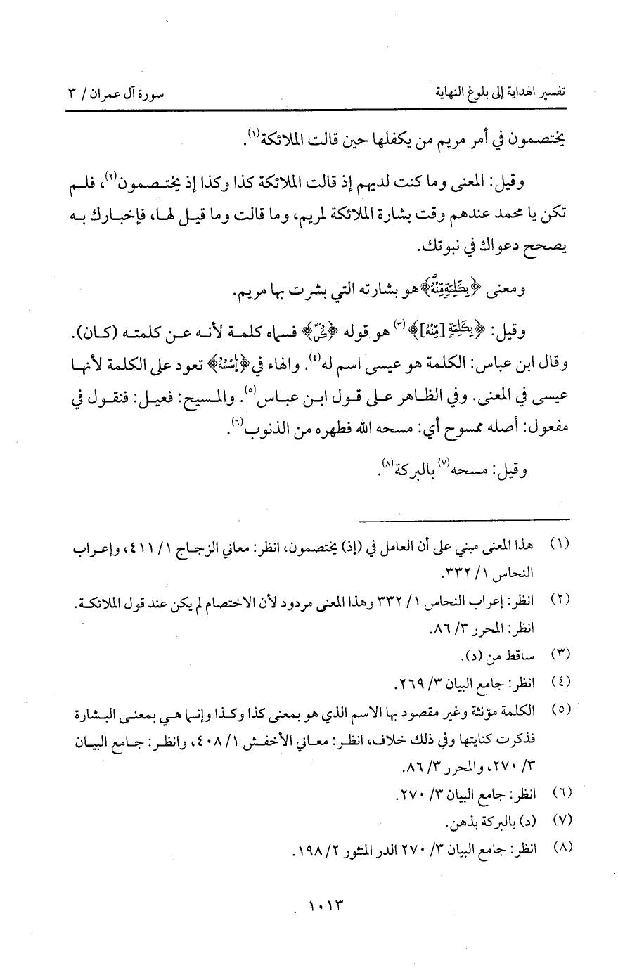 وقيل: {بِكَلِمَةٍ [مِّنْهُ]} هو قوله {كُنْ} فسماه كلمة لأنه عن كلمته (كان). وقال ابن عباس: الكلمة هو عيسى اسم له. والهاء في {اسمه} تعود على الكلمة لأنها عيسى في المعنى. وفي الظاهر على قول ابن عباس. والمسيح: فعيل: فنقول في مفعول: أصله ممسوح أي: مسحه الله فطهره من الذنوب.