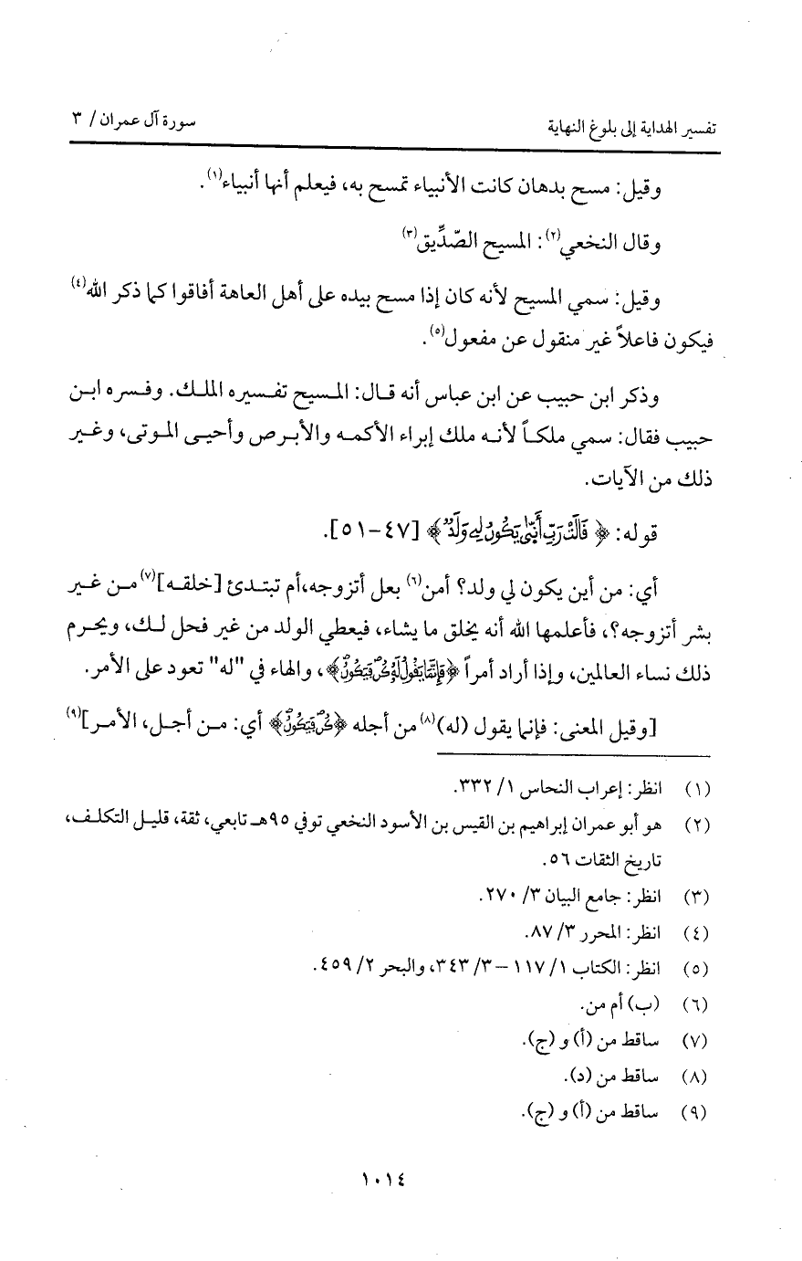 وذكر ابن حبيب عن ابن عباس أنه قال: المسيح تفسيره الملك. وفسره ابن حبيب فقال: سمي ملكاً لأنه ملك إبراء الأكمه والأبرص وأحيى الموتى، وغير ذلك من الآيات.