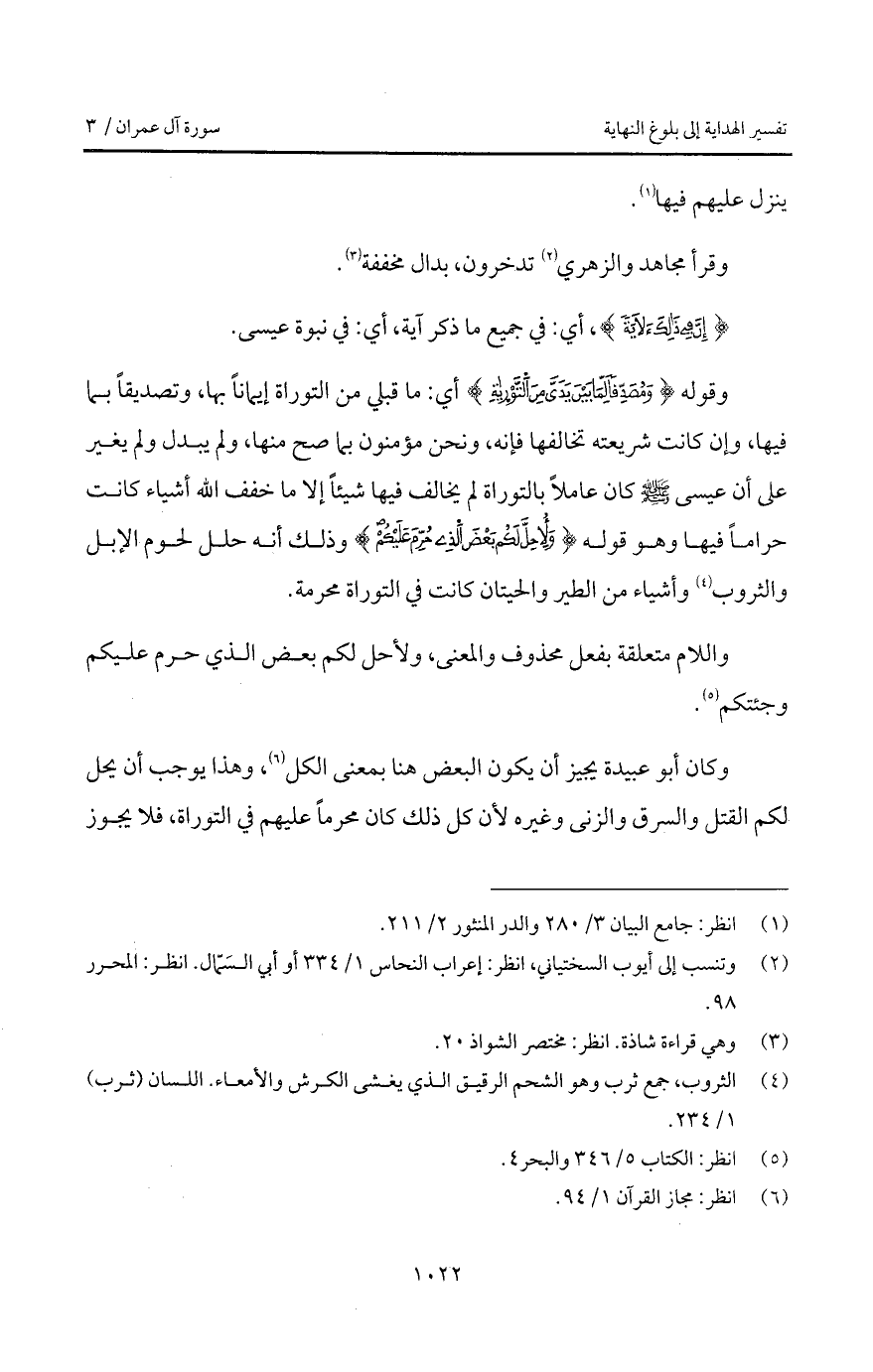 وقوله {وَمُصَدِّقاً لِّمَا بَيْنَ يَدَيَّ مِنَ التوراة} أي: ما قبلي من التوراة إيماناً بها، وتصديقاً بما فيها، وإن كانت شريعته تخالفها فإنه، ونحن مؤمنون بما صح منها، ولم يبدل ولم يغير على أن عيسى A كان عاملاً بالتوراة لم يخالف فيها شيئاً إلا ما خفف الله أشياء كانت حراماً فيها وهو قوله {وَلأُحِلَّ لَكُم بَعْضَ الذي حُرِّمَ عَلَيْكُمْ} وذلك أنه حلل لحوم الإبل والثروب وأشياء من الطير والحيتان كانت في التوراة محرمة.