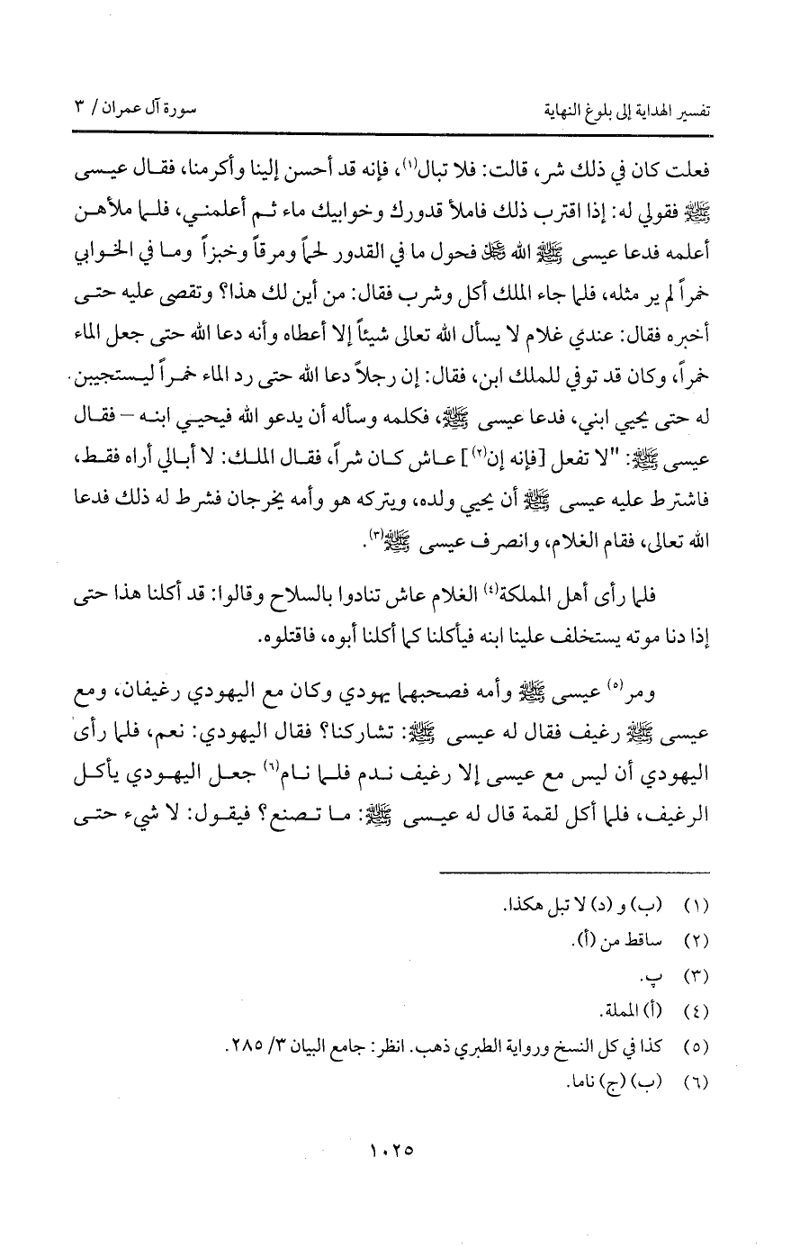 فعلت كان في ذلك شر، قالت: فلا تبال، فإنه قد أحسن إلينا وأكرمنا، فقال عيسى A فقولي له: إذا اقترب ذلك فاملأ قدورك وخوابيك ماء ثم أعلمني، فلما ملأهن أعلمه فدعا عيسى A الله D فحول ما في القدور لحماً ومرقاً وخبزاً وما في الخوابي خمراً لم ير مثله، فلما جاء الملك أكل وشرب فقال: من أين لك هذا؟ وتقصى عليه حتى أخبره فقال: عندي غلام لا يسأل الله تعالى شيئاً إلا أعطاه وأنه دعا الله حتى جعل الماء خمراً، وكان قد توفي للملك ابن، فقال: إن رجلاً دعا الله حتى رد الماء خمراً ليستجيبن له حتى يحيي ابني، فدعا عيسى A، فكلمه وسأله أن يدعو الله فيحيي ابنه - فقال عيسى A: " لا تفعل [فإنه إن] عاش كان شراً، فقال الملك: لا أبالي أراه فقط، فاشترط عليه عيسى A أن يحيي ولده، ويتركه هو وأمه يخرجان فشرط له ذلك فدعا الله تعالى، فقام الغلام، وانصرف عيسى A.