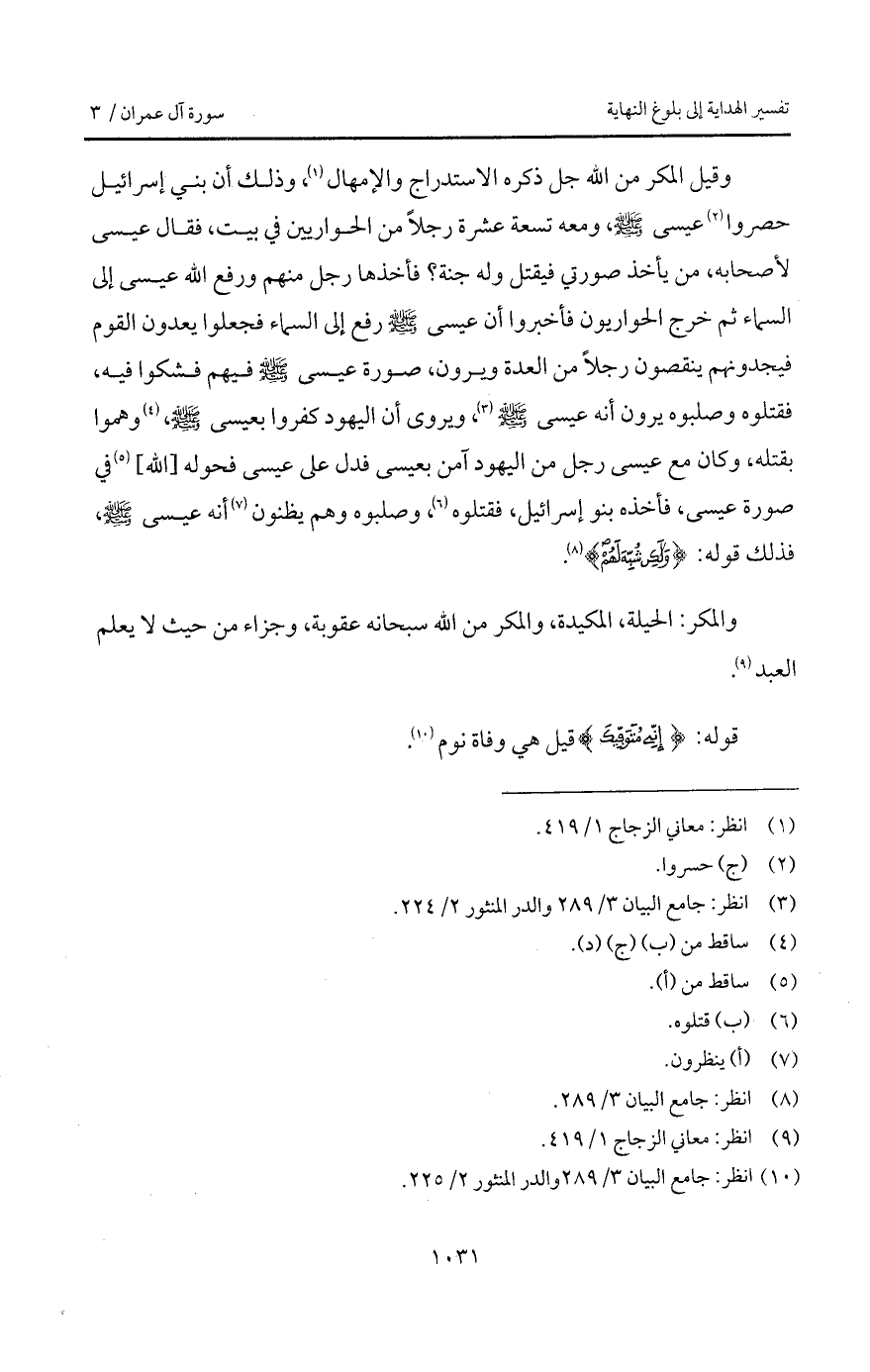 وقيل المكر من الله جل ذكره الاستدراج والإمهال، وذلك أن بني إسرائيل حصروا عيسى A، ومعه تسعة عشرة رجلاً من الحواريين في بيت، فقال عيسى لأصحابه، من يأخذ صورتي فيقتل وله جنة؟ فأخذها رجل منهم ورفع الله عيسى إلى السماء ثم خرج الحواريون فأخبروا أن عيسى A رفع إلى السماء فجعلوا يعدون القوم فيجدونهم ينقصون رجلاً من العدة ويرون، صورة عيسى A فيهم فشكوا فيه، فقتلوه وصلبوه يرون أنه عيسى A، ويروى أن اليهود كفروا بعيسى A، وهموا بقتله، وكان مع عيسى رجل من اليهود آمن بعيسى فدل على عيسى فحوله [الله] في صورة عيسى، فأخذه بنو إسرائيل، فقتلوه، وصلبوه وهم يظنون أنه عيسى A، فذلك قوله: {ولكن شُبِّهَ لَهُمْ}.
