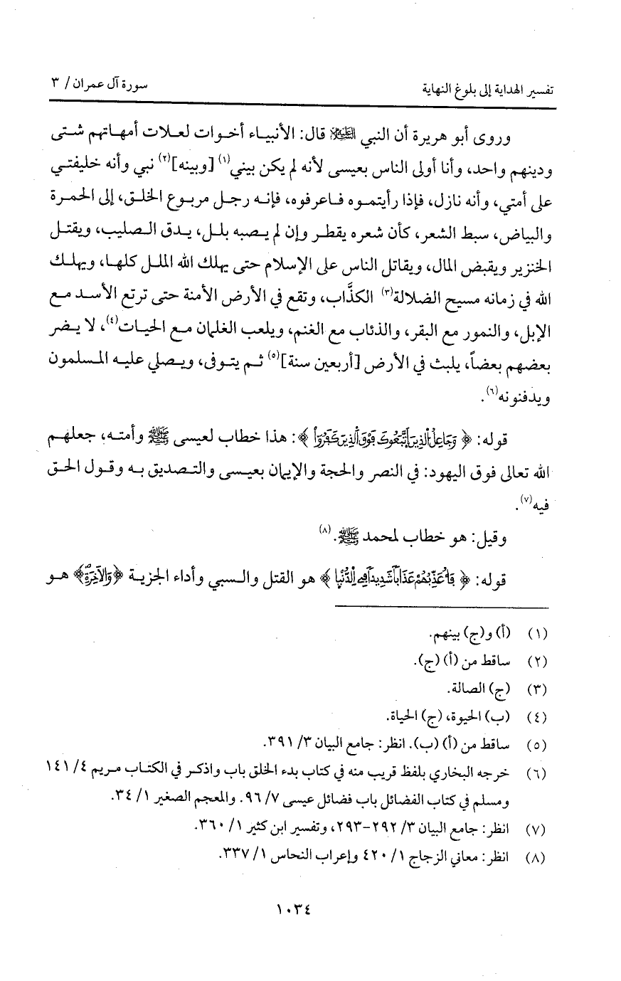 وروى أبو هريرة أن النبي عليه السلام قال: الأنبياء أخوات لعلات أمهاتهم شتى ودينهم واحد، وأنا أولى الناس بعيسى لأنه لم يكن بيني [وبينه] نبي وأنه خليفتي على أمتي، وأنه نازل، فإذا رأيتموه فاعرفوه، فإنه رجل مربوع الخلق، إلى الحمرة والبياض، سبط الشعر، كأن شعره يقطر وإن لم يصبه بلل، يدق الصليب، ويقتل الخنزير ويقبض المال، ويقاتل الناس على الإسلام حتى يهلك الله الملل كلها، ويهلك الله في زمانه مسيح الضلالة الكذَّاب، وتقع في الأرض الأمنة حتى ترتع الأسد مع الإبل، والنمور مع البقر، والذئاب مع الغنم، ويلعب الغلمان مع الحيات، لا يضر بعضهم بعضاً، يلبث في الأرض [أربعين سنة] ثم يتوفى، ويصلي عليه المسلمون ويدفنونه.
