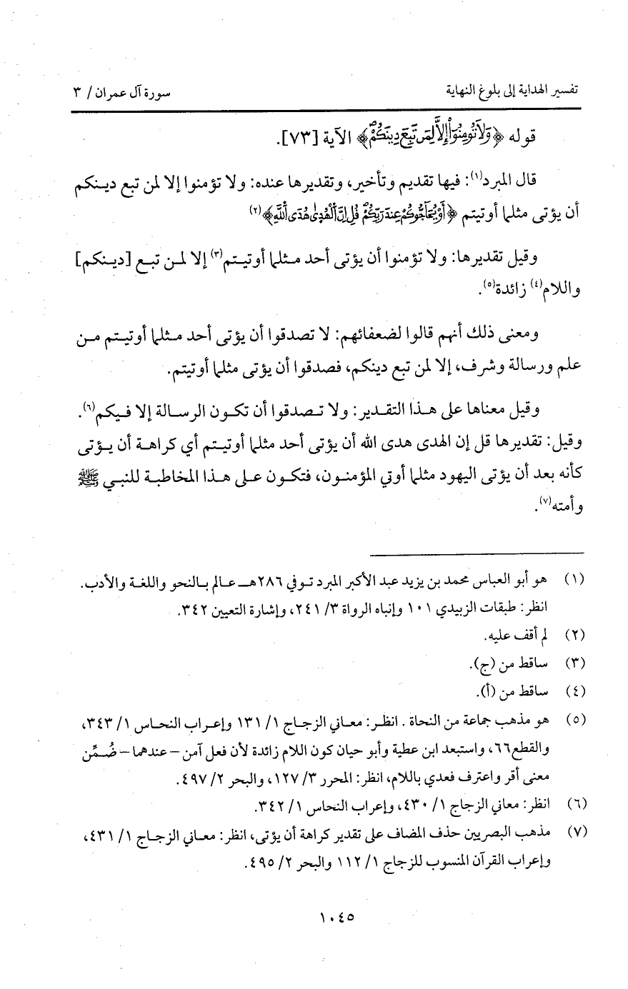 قال المبرد: فيها تقديم وتأخير، وتقديرها عنده: ولا تؤمنوا إلا لمن تبع دينكم أن يؤتى مثلما أوتيتم {أَوْ يُحَآجُّوكُمْ عِندَ رَبِّكُمْ قُلْ إِنَّ الهدى هُدَى الله}