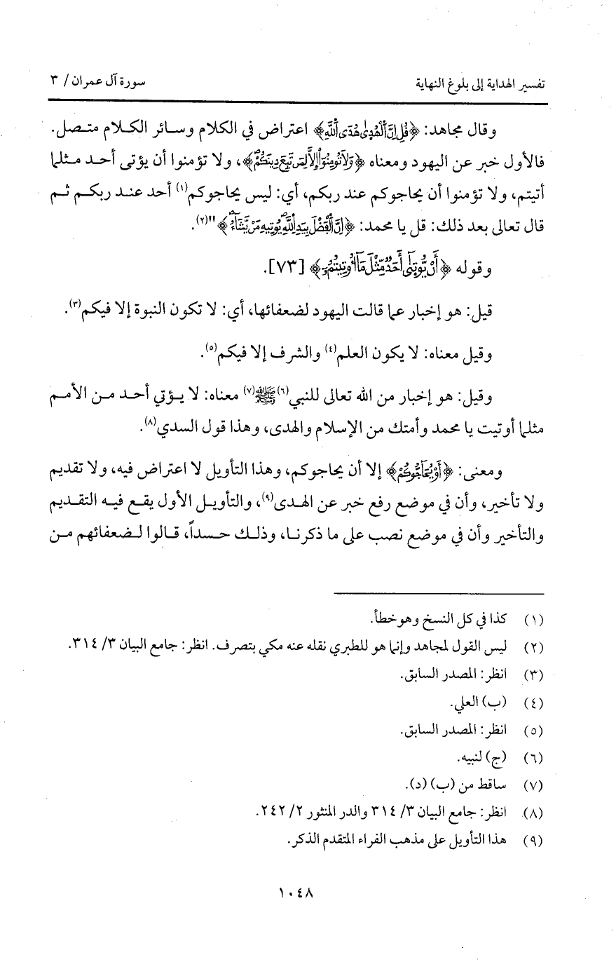 وقال مجاهد: {قُلْ إِنَّ الهدى هُدَى الله} اعتراض في الكلام وسائر الكلام متصل. فالأول خبر عن اليهود ومعناه {وَلاَ تؤمنوا إِلاَّ لِمَن تَبِعَ دِينَكُمْ}، ولا تؤمنوا أن يؤتى أحد مثلما أتيتم، ولا تؤمنوا أن يحاجوكم عند ربكم، أي: ليس يحاجوكم أحد عند ربكم ثم قال تعالى بعد ذلك: قل يا محمد: {إِنَّ الفضل بِيَدِ الله يُؤْتِيهِ مَن يَشَآءُ}.