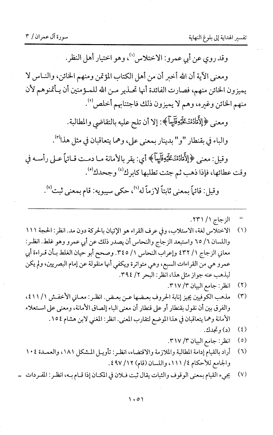 والباء في بقنطار " و " بدينار بمعنى على، وهما يتعاقبان في مثل هذا.
