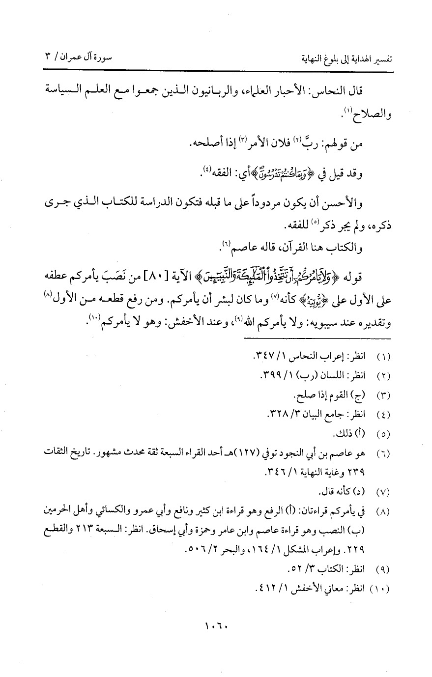 قوله {وَلاَ يَأْمُرَكُمْ أَن تَتَّخِذُواْ الملائكة والنبيين} الآية من نَصَبَ يأمركم عطفه على الأول على {يُؤْتِيهُ} كأنه وما كان لبشر أن يأمركم. ومن رفع قطعه من الأول وتقديره عند سيبويه: ولا يأمركم الله، وعند الأخفش: وهو لا يأمركم.