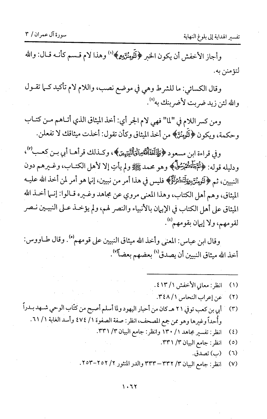 وفي قراءة ابن مسعود {وَإِذْ أَخَذَ الله مِيثَاقَ النبيين}، وكذلك قرأها أبي بن كعب، ودليله قوله: {ثُمَّ جَآءَكُمْ رَسُولٌ} وهو محمد A ولم يأتِ إلا لأهل الكتاب، وغيرهم دون النبيين، ثم {لَتُؤْمِنُنَّ بِهِ وَلَتَنصُرُنَّهُ} فليس في هذا أمر من نبيين، إنما هو أمر لمن أخذ الله عليه الميثاق، وهم أهل الكتاب، وهذا المعنى مروي عن مجاهد وغيره قالوا: إنما أخذ الله الميثاق على أهل الكتاب في الإيمان بالأنبياء والنصر لهم، ولم يؤخذ على النبيين نصر لقومهم، ولا إيمان بقومهم.