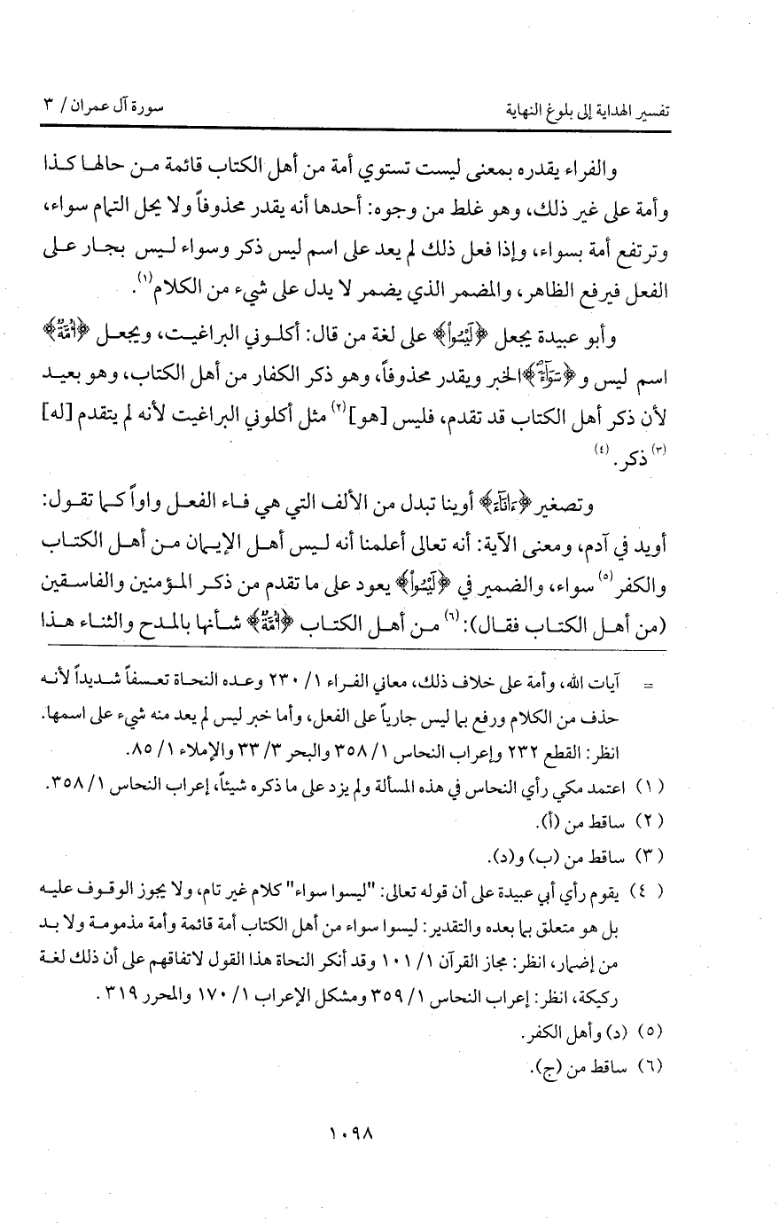 وأبو عبيدة يجعل {لَيْسُواْ} على لغة من قال: أكلوني البراغيث، ويجعل {أُمَّةٌ} اسم ليس و {سَوَآءً} الخبر ويقدر محذوفاً، وهو ذكر الكفار من أهل الكتاب، وهو بعيد لأن ذكر أهل الكتاب قد تقدم، فليس [هو] مثل أكلوني البراغيث لأنه لم يتقدم [له] ذكر.