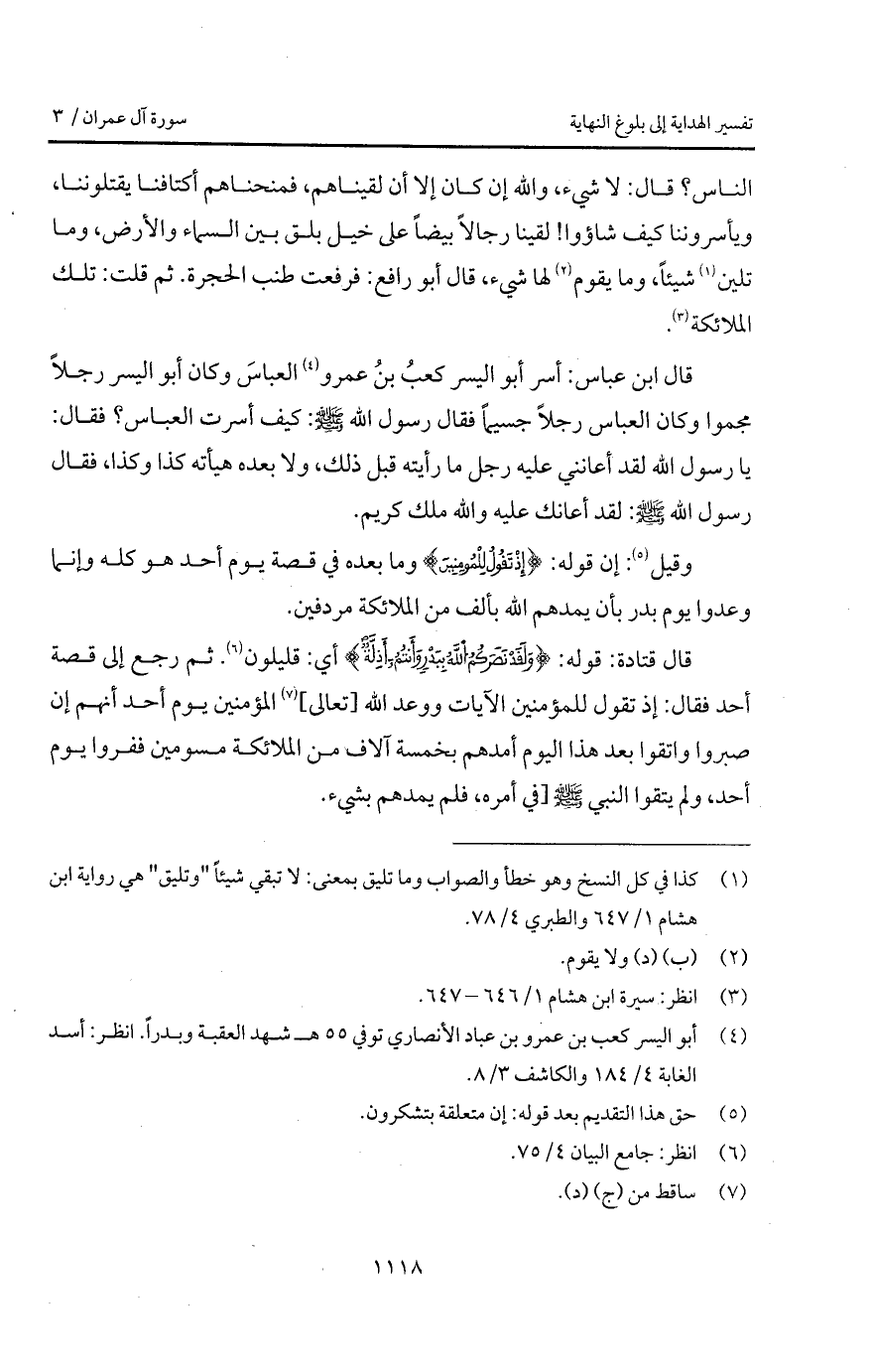 قال قتادة: قوله: {وَلَقَدْ نَصَرَكُمُ الله بِبَدْرٍ وَأَنْتُمْ أَذِلَّةٌ} أي: قليلون. ثم رجع إلى قصة أحد فقال: إذ تقول للمؤمنين الآيات ووعد الله [تعالى] المؤمنين يوم أحد أنهم إن ثبروا واتقوا بعد هذا اليوم أمدهم بخمسة آلاف من الملائكة مسمين ففروا يوم أخد، ولم يتقوا النبي A [ في أمره، فلم يمدهم بشيء.