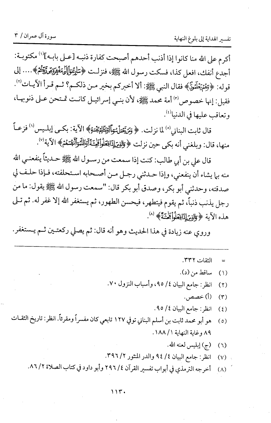 قال علي بن أبي طالب: كنت إذا سمعت من رسول الله A حديثاً ينفعني الله منه بما يشاء أن ينفعني، وإذا حدثني رجل من أصحابه استحلفته، فإذا حلف لي صدقته، وحدثني أبو بكر، وصدق أبو بكر قال: " سمعت رسول الله A يقول: ما من رجل يذنب ذنباً، ثم يقوم فيتطهر، فيحسن الطهور، ثم يستغفر الله إلا غفر له " ثم تلى هذه الآية {والذين إِذَا فَعَلُواْ فَاحِشَةً}.