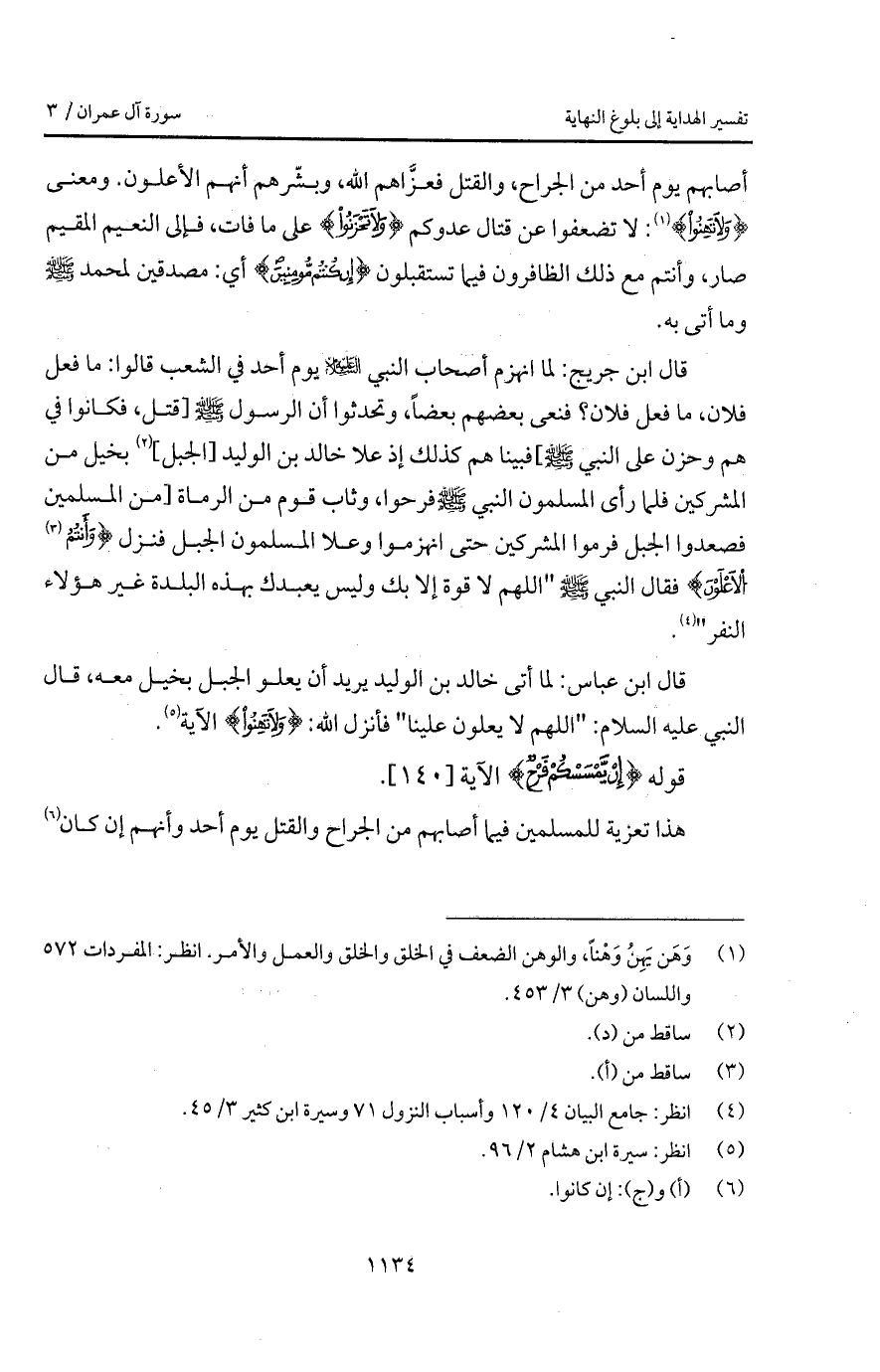 قال ابن جريج: " لما انهزم أصحاب النبي عليه السلام يوم أحد في الشعب قالوا: ما فعل فلان، ما فعل فلان؟ فنعى بعضهم بعضاً، وتحدثوا أن الرسول A [ قتل، فكانوا في هم وحزن على النبي A] فبينا هم كذلك إذ علا خالد بن الوليد [الجبل] بخيل من المشركين فلما رأى المسلمون النبي A فرحوا، وثاب قوم من الرماة [من المسلمين فصعدوا الجبل فرموا المشركين حتى انهزموا وعلا المسلمون الجبل فنزل {وَأَنْتُمُ الأَعْلَوْنَ} فقال النبي A " اللهم لا قوة إلا بك وليس يعبدك بهذه البلدة غير هؤلاء النفر " ".