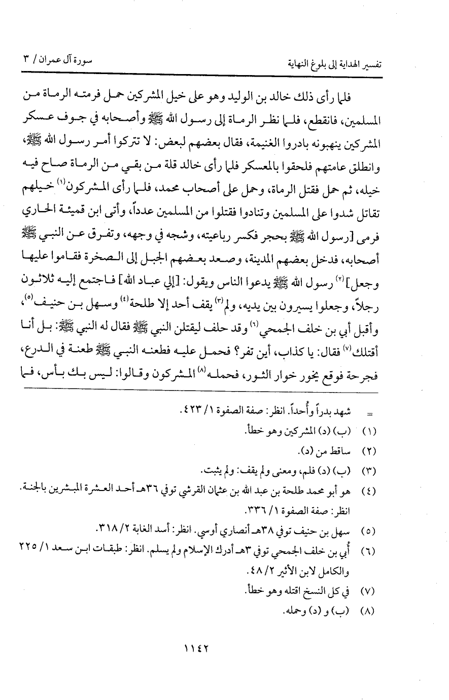 فلما رأى ذلك خالد بن الوليد وهو على خيل المشركين حمل فرمته الرماة من المسلمين، فانقطع، فلما نظر الرماة إلى رسول الله A وأصحابه في جوف عسكر المشركين ينهبونه بادروا الغنيمة، فقال بعضهم لبعض: لا تتركوا أمر رسول الله A، وانطلق عامتهم فلحقوا بالمعسكر فلما رأى خالد قلة من بقي من الرماة صاح فيه خيله، ثم حمل فقتل الرماة، وحمل على أصحاب محمد، فلما رأى المشركون خيلهم تقاتل شدوا على المسلمين وتنادوا فقتلوا من المسلمين عدداً، وأتى ابن قميئة الحاري فرمى [رسول الله A بحجر فكسر رباعيته، وشجه في وجهه، وتفرق عن النبي A أصحابه، فدخل بعضهم المدينة، وصعد بعضهم الجبل إلى الصخرة فقاموا عليها وجعل] رسول الله A يدعوا الناس ويقول: [إلي عباد الله] فاجتمع إليه ثلاثنون رجلاً، وجعلوا يسيرون بين يديه، ولم يقف أحد إلا طلحة وسهل بن حنيف، وأقبل أبي بن خلف الجمحي وقد حلف ليقتلن النبي A فقال له النبي A: بل أنا أقتلك فقال: يا كذاب، أين تفر؟ فحمل عليه فطعنه النبي A طعنة في الدرع، فجرحة فوقه يخور خوار الثور، فحماه المشركون وقالوا: ليس بك بأس، فما