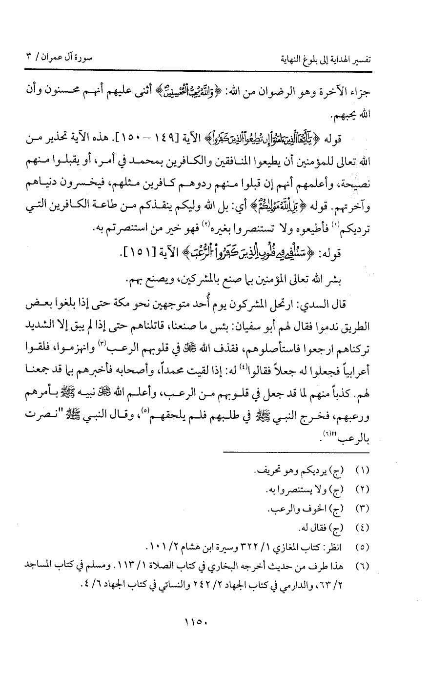 قال السدي: " ارتحل المشركون يوم أُحد متوجهين نحو مكة إذا بلغوا بعض الطريق ندموا فقال لهم أبو سفيان: بئس ما صنعنا، قاتلناهم حتى إذا لم يبق إلا الشديد تركناهم ارجعوا فاستأصلوهم، فقذف الله D في قلوبهم الرعب وانهزموا، فلقوا أعرابياً فجعلوا له جعلاً فقالوا له: إذا لقيت محمداً، وأصحابه فأخبرهم بما قد جمعنا لهم. كذباً منهم لما قد جعل في قلوبهم من الرعب، وأعلم الله D نبيه A بأمرهم ورعبهم، فخرج النبي A في طلبهم فلم يلحقهم، وقال النبي A " نصرت بالرعب " ".