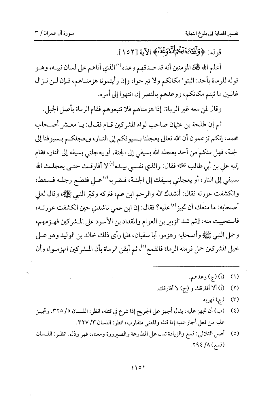 ثم إن طلحة بن عثمان صاحب لواء المشركين قام فقال: يا معشر أصحاب محمد، إنكم تزعمون أن الله تعالى يعجلنا بسيوفكم إلى النار، ويعجلكم بسيوفنا إلى الجنة، فهل منكم من أحد يعجله الله بسيفي إلى الجنة، أو يعجلني بسيفه إلى النار، فقام إليه علي بن أبي طالب Bهـ فقال: والذي نفسي بيده لا أفارقك حتى يعجلك الله بسيفي إلى النار، أو يعجلني بسيفك إلى الجنة، فضربه علي فقطع رجله فسقط، وانكشفت عورته فقال: أنشدك الله والرحم ابن عم، فتركه وكبّر النبي A، وقال لعلي أصحابه: ما منعك أن تجيز عليه؟ فقال: إن ابن عمي ناشدني حين انكشفت عورته، فاستحييت منه، [ثم شد الزبير بين العوام والمقداد بن الأسود على المشركين فهزمهم، وحمل النبي A وأصحابه وهزموا أبا سفيان، فلما رأى ذلك خالد بن الوليد وهو على خيل المشركين حمل فرمته الرماة فنقمع، ثم أيقن الرماة بأن المشركين انهزموا، وأن