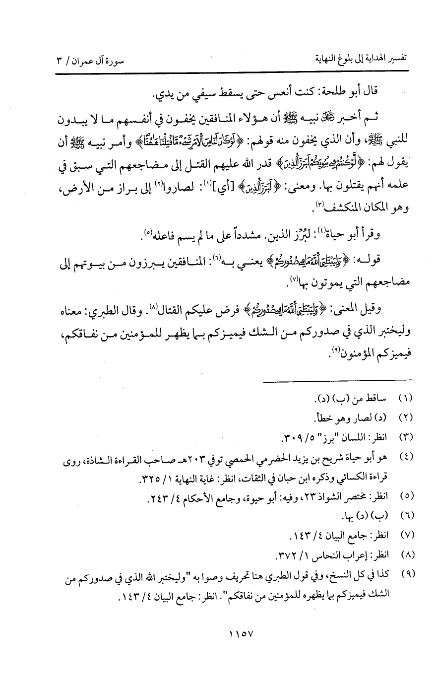 ثم أخبر D نبيه A أن هؤلاء المنافقين يخفون في أنفسهم ما لا يبدون للنبي A، وأن الذي يخفون منه قولهم: {لَوْ كَانَ لَنَا مِنَ الأمر شَيْءٌ مَّا قُتِلْنَا هاهنا} وأمر نبيه A أن يقول لهم: {لَّوْ كُنتُمْ فِي بُيُوتِكُمْ لَبَرَزَ الذين} قدر الله عليهم القتل إلى مضاجعهم التي سبق في علمه أنهم يقتلون بها. ومعنى: {لَبَرَزَ الذين} [أي]: لصاروا إلى براز من الأرض، وهو المكان المنكشف.