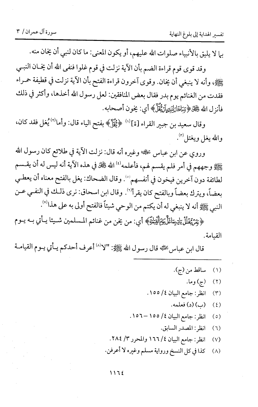 وروي عن ابن عباس Bهـ وغيره أنه قال: نزلت الآية في طلائع كان رسول الله A وجههم في أمر فلم يقسم لهم، فأعلمه الله D في هذه الآية أنه ليس له أن يقسم لطائفة دون آخرين فيخون في أنفسهم. وقال الضحاك: يغل بالفتح معناه أن يعطي بعضاً، ويترك بعضاً وبالفتح كان يقرأ. وقال ابن اسحاق: نرى ذلك في النفي عن النبي A أنه لا ينبغي له أن يكتم من الوحي شيئاً فالفتح أولى به على هذا.