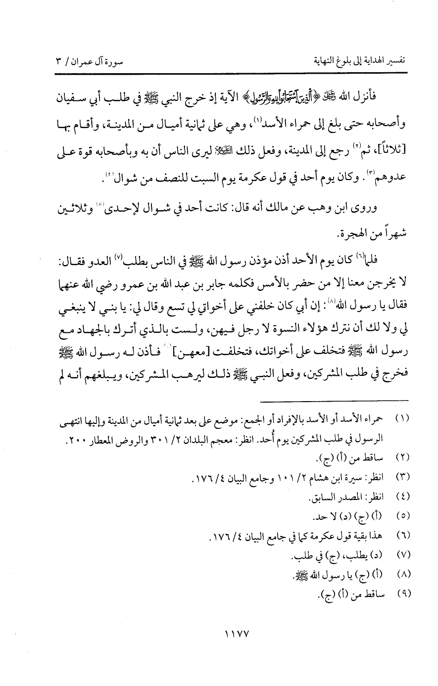 فأنزل الله D { الذين استجابوا للَّهِ والرسول} الآية إذ خرج النبي A في طلب أبي سفيان وأصحابه حتى بلغ إلى خمراء الأسد، وهي على ثمانية أميال من المدينة، وأقام بها [ثلاثاً]، ثم رجع إلى المدينة، وفعل ذلك عليه السلام ليرى الناس أن به وبأصحابه قوة على عدوهم. وكان يوم أحد في قول عكرمة يوم السبت للنصف من شوال.