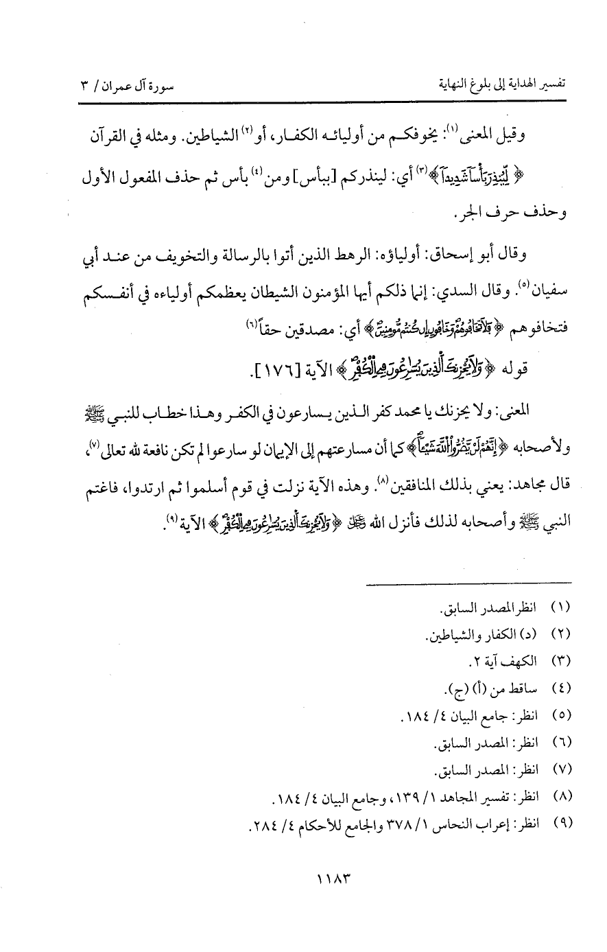 المعنى: ولا يحزنك يا محمد كفر الذين يسارعون في الكفر وهذا خطاب للنبي A ولأصحابه {إِنَّهُمْ لَن يَضُرُّواْ الله شَيْئاً} كما أن مسارعتهم إلى الإيمان لو سارعوا لم تكن نافعة لله تعالى، قال مجاهد: يعني بذلك المنافقين. وهذه الآية نزلت في قوم أسلموا ثم ارتدوا، فاغتم النبي A وأصحابه لذلك فأنزل الله D { وَلاَ يَحْزُنكَ الذين يُسَارِعُونَ فِي الكفر} الآية.