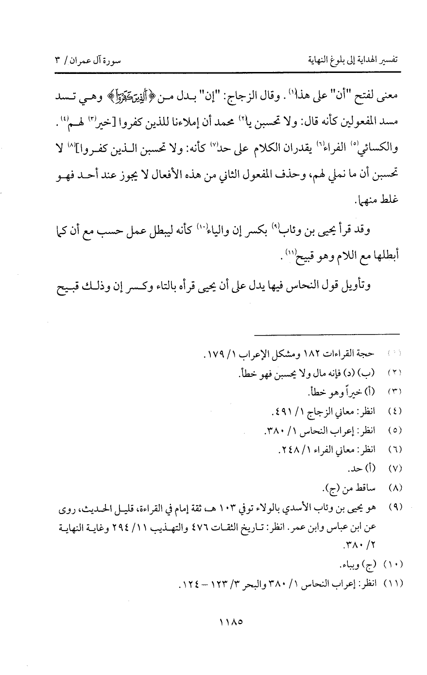 معنى لفتح " أن " على هذا. وقال الزجاج: " إن " بدل من {الذين كَفَرُواْ} وهي تسد مسد المفعولين كأنه قال: ولا تحسبن يا محمد أن إملاءنا للذين كفروا [خير لهم. والكسائي الفراء يقدران الكلام على حد كأنه: ولا تحسبن الذين كفروا] لا تحسبن أن ما نملي لهم، وحذف المفعول الثاني من هذه الأفعال لا يجوز عند أحد فهو غلط منهما.