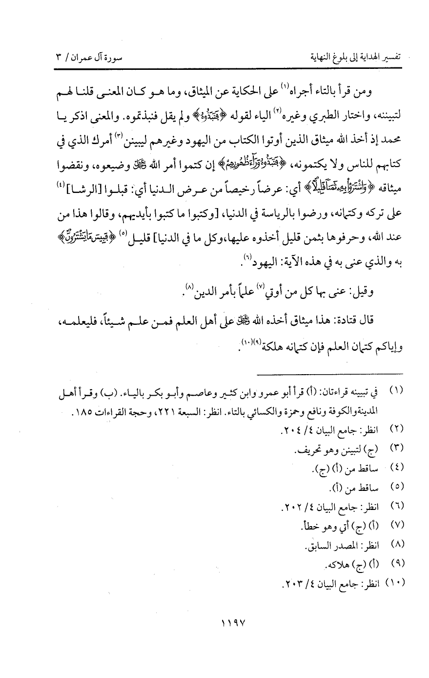 ومن قرأ بالتاء أجراه على الحكاية عن الميثاق، وما هو كان المعنى قلنا لهم لتبيننه، واختار الطبري وغيره الياء لقوله {فَنَبَذُوهُ} ولم يقل فنبذتموه. والمعنى اذكر يا محمد إذ أخذ الله ميثاق الذين أوتوا الكتاب من اليهود وغيرهم ليبينن أمرك الذي في كتابهم للناس ولا يكتمونه، {فَنَبَذُوهُ وَرَآءَ ظُهُورِهِمْ} إن كتموا أمر الله D وضيعوه، ونقضوا ميثاقه {واشتروا بِهِ ثَمَناً قَلِيلاً} أي: عرضاً رخيصاً من عرض الدنيا: قبلوا [الرشا] على تركه وكتمانه، ورضوا بالرياسة في الدنيا، [وكتبوا ما كتبوا بأيديهم، وقالوا هذا من عند الله، وحرفوها بثمن قليل أخذوه عليها، وكل ما في الدنيا] قليل {فَبِئْسَ مَا يَشْتَرُونَ} به والذي عنى به في هذه الآية: اليهود.