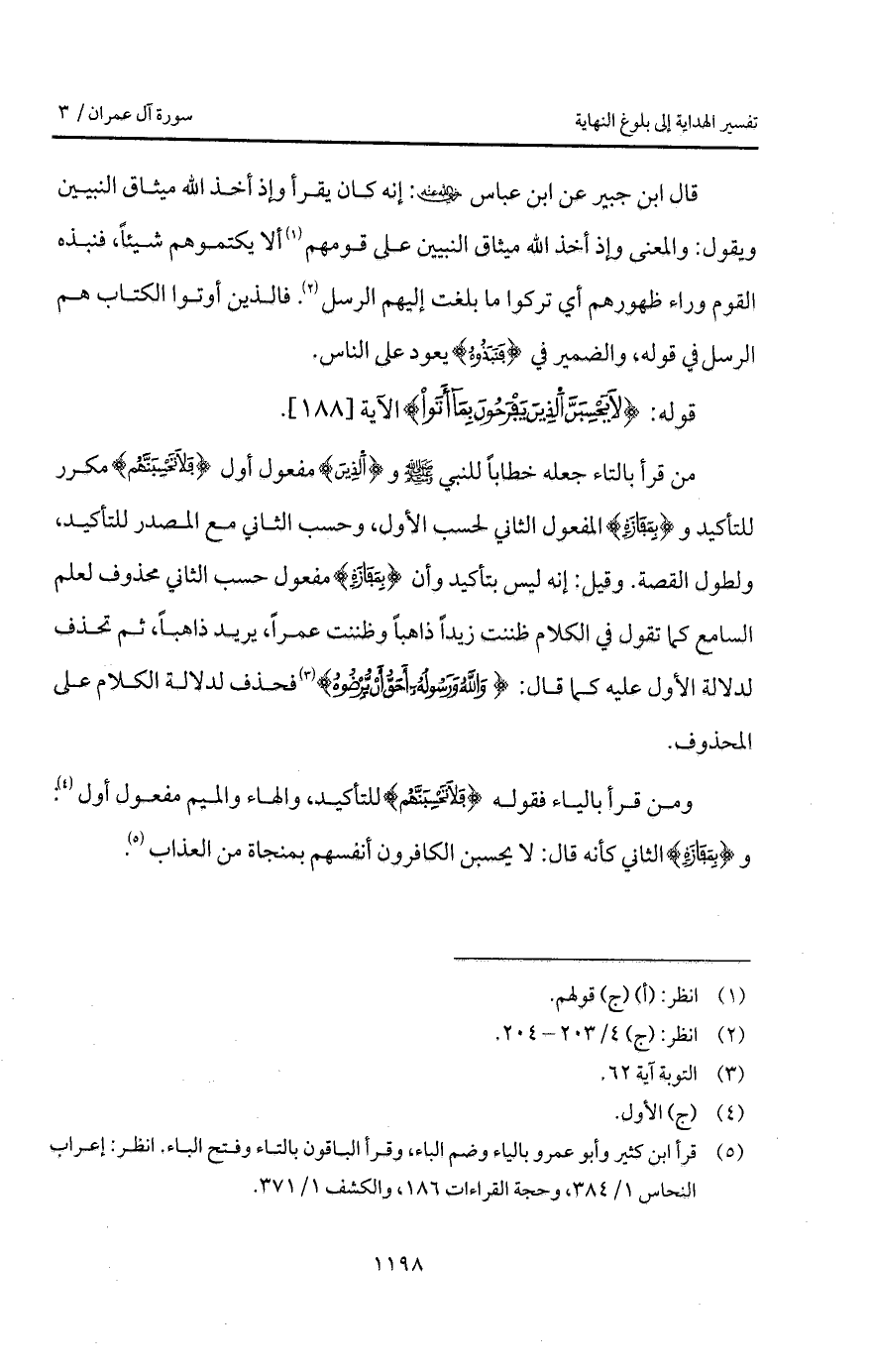 قال ابن جبير عن ابن عباس Bهـ: إنه كان يقرأ وإذ أخذ الله ميثاق النبيين ويقول: والمعنى وإذ أخذ الله ميثاق النبيين على قومهم ألا يكتموهم شيئاً، فنبذه القوم وراء ظهورهم أي تركوا ما بلغت إليهم الرسل. فالذين أوتوا الكتاب هم الرسل في قوله، والضمير في {فَنَبَذُوهُ} يعود على الناس.