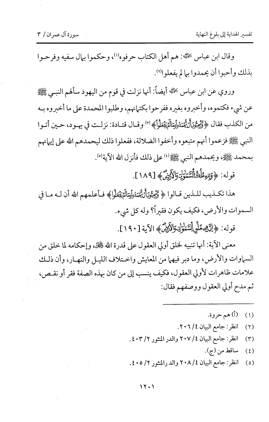 وروي عن ابن عباس Bهـ أيضاً: أنها نزلت في قوم من اليهود سألهم النبي A عن شيء فكتموه، وأخبروه بغيره ففرحوا بكتمانهم، وطلبوا المحمدة على ما أخبروه به من الكذب فقال {وَّيُحِبُّونَ أَن يُحْمَدُواْ بِمَا لَمْ يَفْعَلُواْ} وقال قتادة: نزلت في يهود، حين أتوا النبي A فزعموا أنهم متبعوه وأخفوا الضلالة، ففعلوا ذلك ليحمدهم الله على إيمانهم بمحمد A، ويحمدهم النبي A على ذلك فأنزل الله الآية.