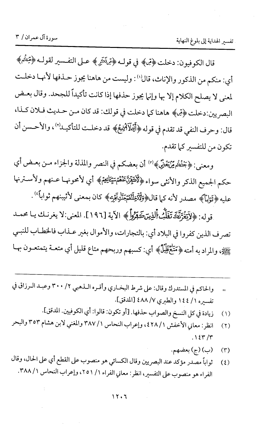 قال الكوفيون: دخلت {مِّن} في قوله {مِّن ذَكَرٍ} على التفسير لقوله {مِّنْكُمْ} أي: منكم من الذكور والإناث، قال: وليست من هناهنا يجوز حذفها لأنها دخلت لمعنى لا يصلح الكلام إلا بها وإنما يجوز حذفها إذا كانت تأكيداً للجحد. وقال بعض البصريين: دخلت {مِّن} هناهنا كما دخلت في قولك: قد كان من حديث فلان كذا، قال: وحرف النفي قد تقدم في قوله {أَنِّي لاَ أُضِيعُ} قد دخلت للتأكيد، والأحسن أن تكون من للتفسير كما تقدم.