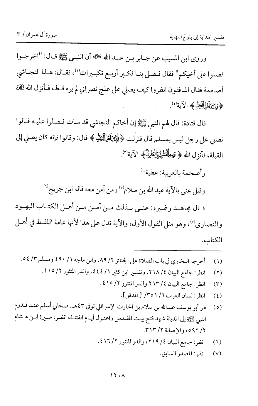 وروى ابن المسيب عن جابر بن عبد الله Bهـ " أن النبي A قال: " اخرجوا فصلوا على أخيكم " فقال فصلى بنا فكبر أربع تكبيرات، فقال: هذا النجاشي أصحمة فقال المنافقون انظروا كيف يصلي على علج نصراني لم يره قط، فأنزل الله D { وَإِنَّ مِنْ أَهْلِ الكتاب} الآية ".