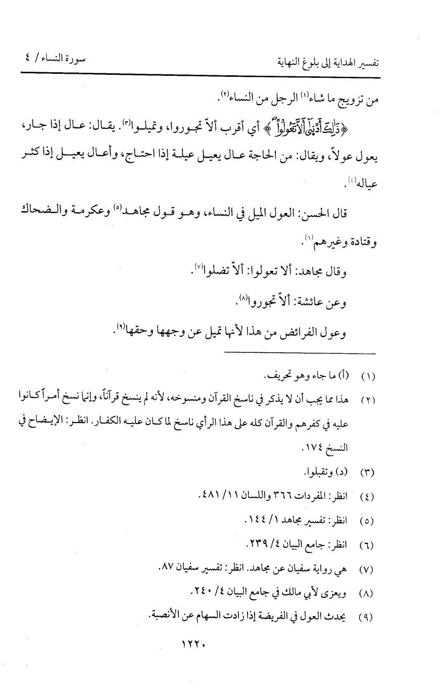 قال الحسن: العول الميل في النساء، وهو قول مجاهد وعكرمة والضحاك وقتادة وغيرهم.