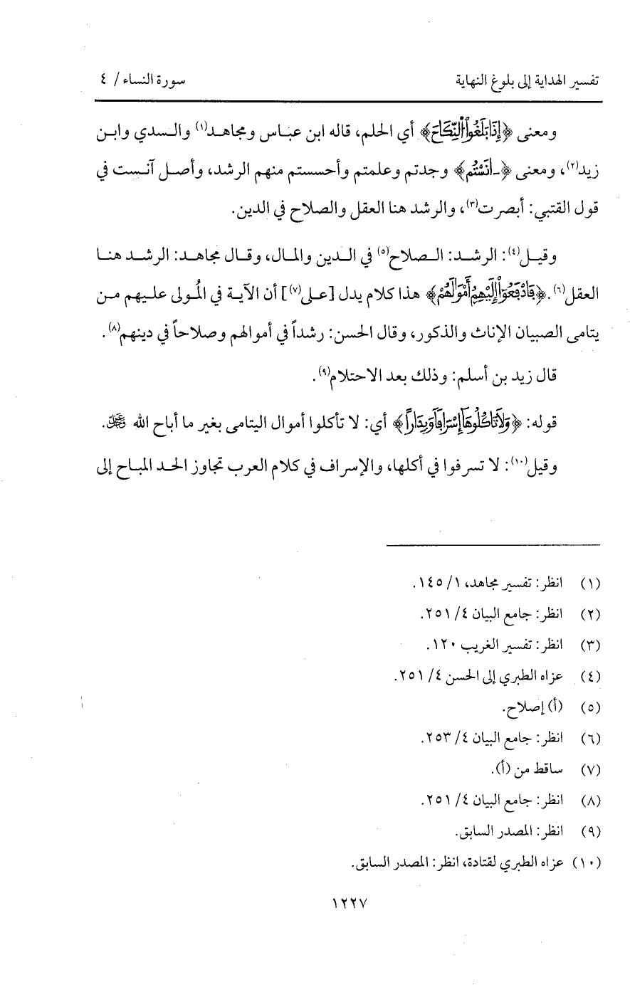 ومعنى {إِذَا بَلَغُواْ النِّكَاحَ} أي الحلم، قاله ابن عباس ومجاهد والسدي وابن زيد، ومعنى {آنَسْتُمْ} وجدتم وعلمتم وأحسستم منهم الرشد، وأصل آنست في قول القتبي: أبصرت، والرشد هنا العقل والصلاح في الدين.