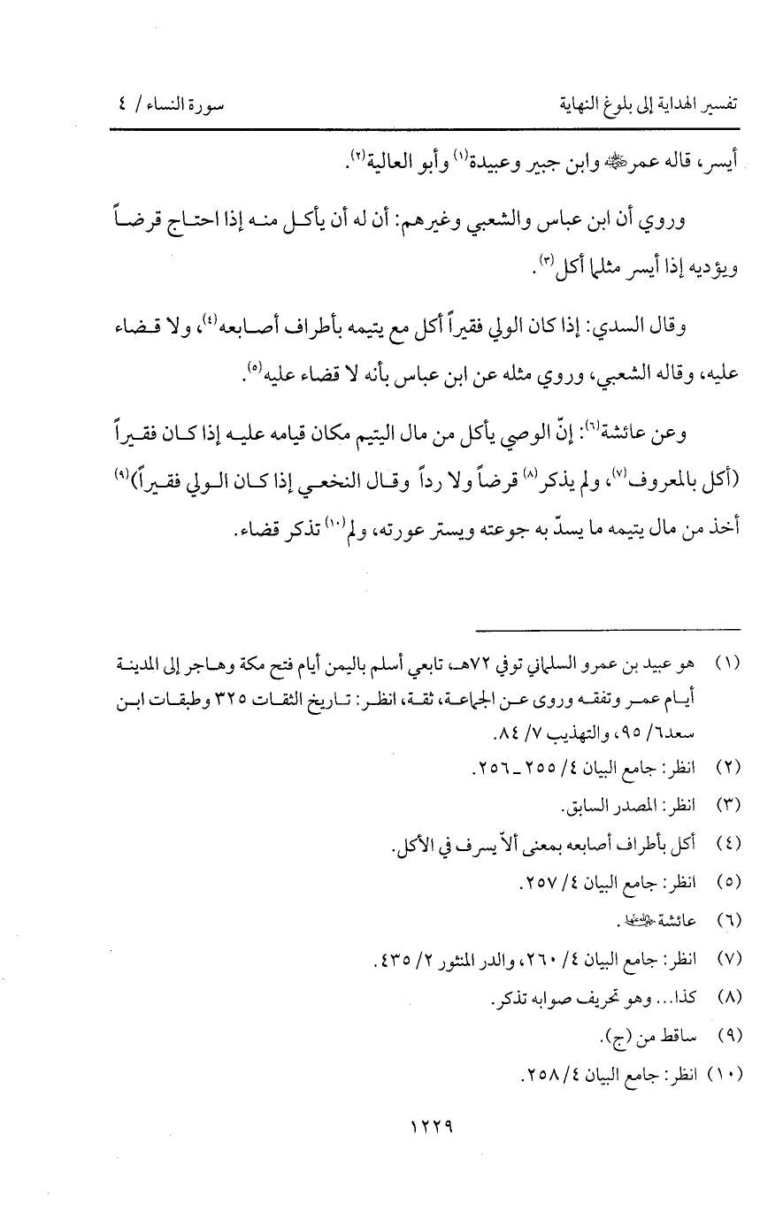 وعن عائشة: إنّ الوصي يأكل من مال اليتيم مكان قيامه عليه إذا كان فقيراً (أكل بالمعروف، ولم يذكر قرضاً ولا رداً وقال النخعي إذا كان الولي فقيراً) أخذ من مال يتيمه ما يسدّ به جوعته ويستر عورته، ولم تذكر قضاء.