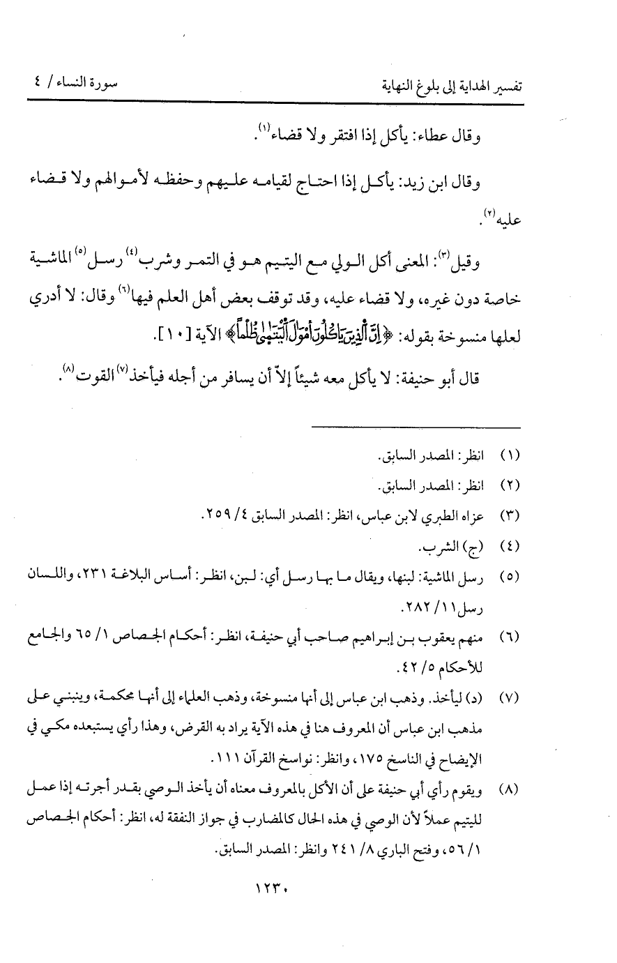 وقيل: المعنى أكل الولي مع اليتيم هو في التمر وشرب رسل الماشية خاصة دون غيره، ولا قضاء عليه، وقد توقف بعض أهل العلم فيها وقال: لا أدري لعلها منسوخة بقوله: {إِنَّ الذين يَأْكُلُونَ أَمْوَالَ اليتامى ظُلْماً} الآية [10].