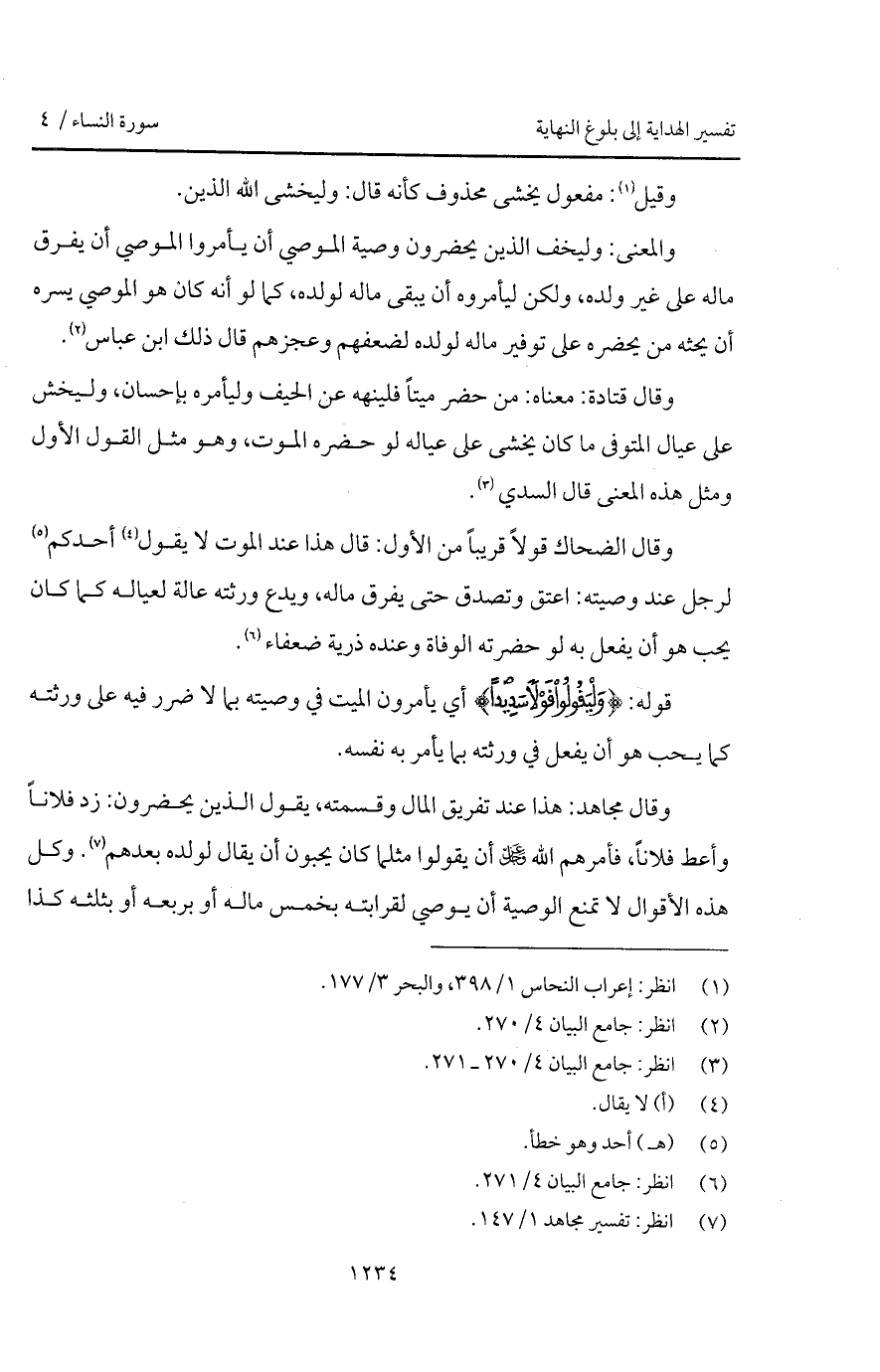 وقال مجاهد: هذا عند تفريق المال وقسمته، يقول الذين يحضرون: زد فلاناً وأعط فلاناً، فأمرهم الله D أن يقولوا مثلما كان يحبون أن يقال لولده بعدهم. وكل هذه الأقوال لا تمنع الوصية أن يوصي لقرابته بخمس ماله أو بربعه أو بثلثه كذا