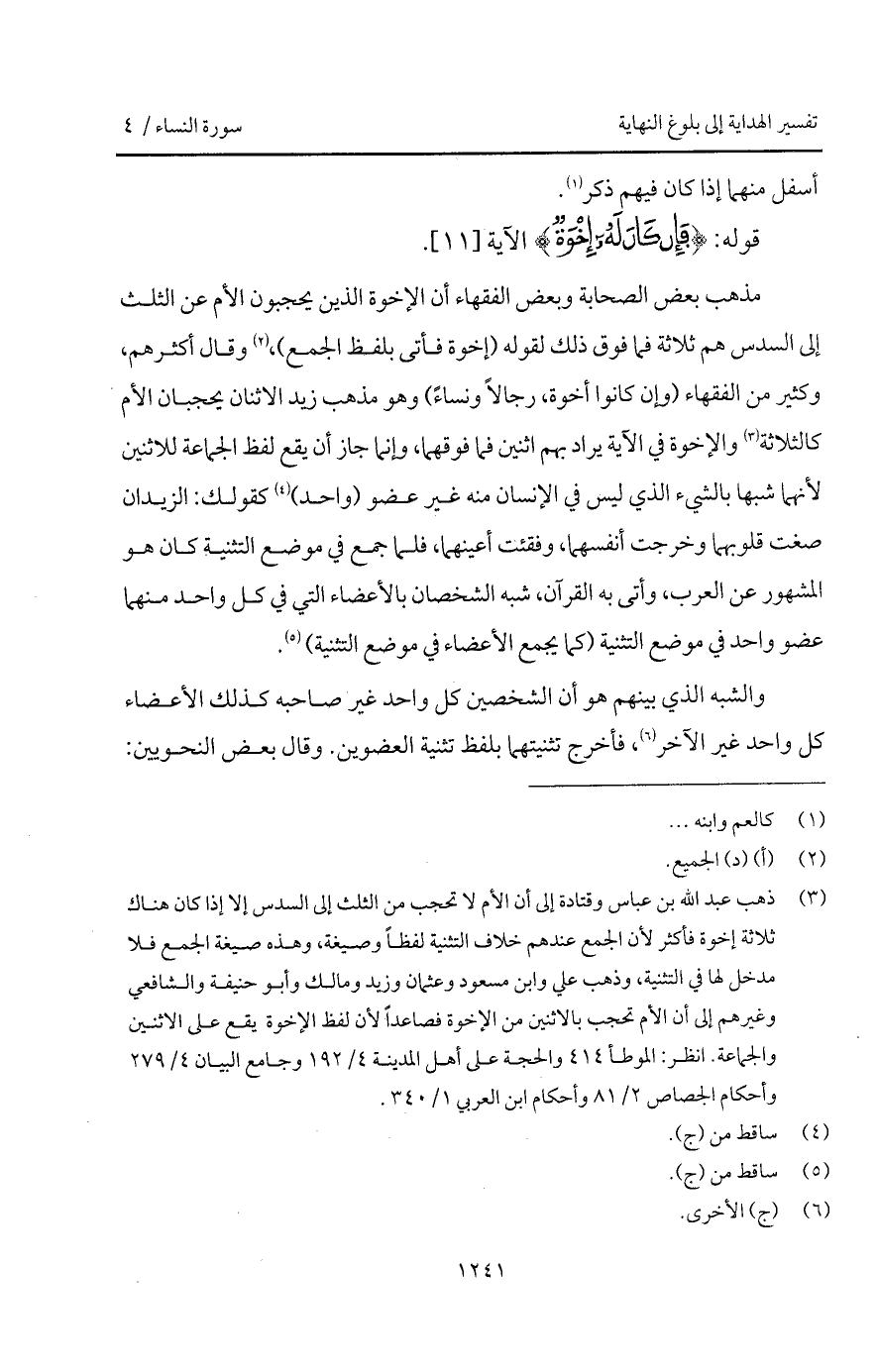 مذهب بعض الصحابة وبعض الفقهاء أن الإخوة الذين يحجبون الأم عن الثلث إلى السدس هم ثلاثة فما فوق ذلك لقوله (إخوة فأتى بلفظ الجمع)، وقال أكثرهم، وكثير من الفقهاء (وإن كانوا أخوة، رجالاً ونساءً) وهو مذهب زيد الاثنان يحجبان الأم كالثلاثة والإخوة في الآية يراد بهم اثنين فما فوقهما، وإنما جاز أن يقع لفظ الجماعة للاثنين لأنهما شبها بالشيء الذي ليس في الإنسان منه غير عضو (واحد) كقولك: الزيدان صغت قلوبهما وخرجت أنفسهما، وفقئت أعينهما، فلما جمع في موضع التثنية كان هو المشهور عن العرب، وأتى به القرآن، شبه الشخصان بالأعضاء التي في كل واحد منهما عضو واحد في موضع التثنية (كما يجمع الأعضاء في موضع التثنية).