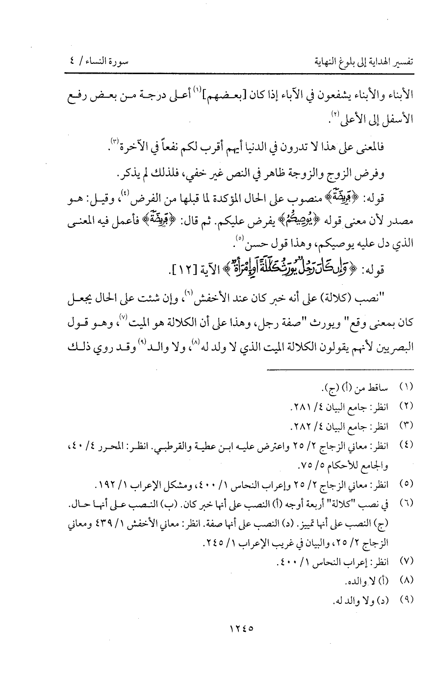 " نصب (كلالة) على أنه خبر كان عند الأخفش، وإن شئت على الحال يجعل كان بمعنى وقع " ويورث " صفة رجل، وهذا على أن الكلالة هو الميت، وهو قوله البصريين لأنهم يقولون الكلالة الميت الذي لا ولد له، ولا والد وقد روي ذلك