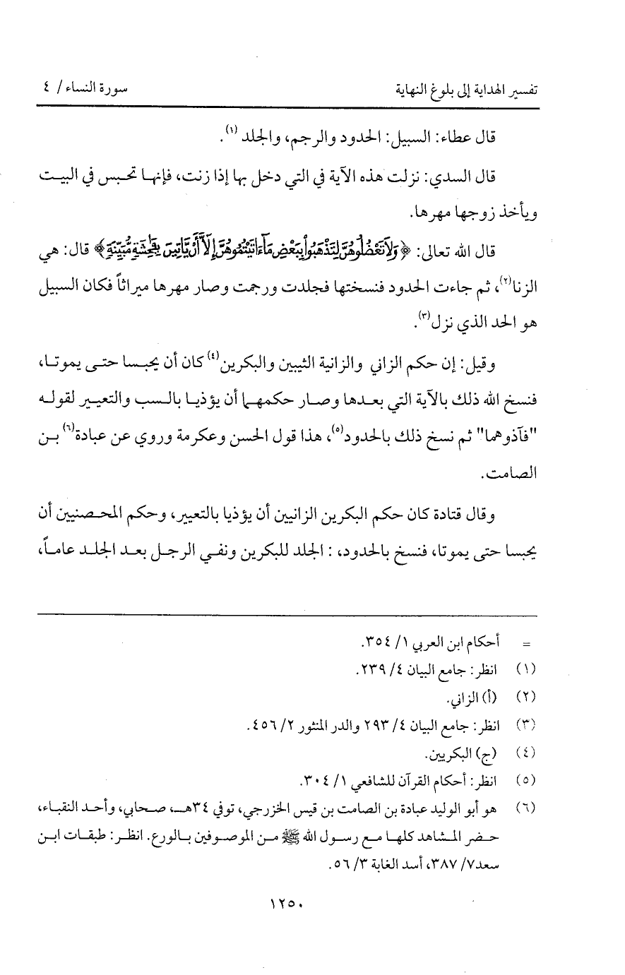 قال الله تعالى: {وَلاَ تَعْضُلُوهُنَّ لِتَذْهَبُواْ بِبَعْضِ مَآ آتَيْتُمُوهُنَّ إِلاَّ أَن يَأْتِينَ بِفَاحِشَةٍ مُّبَيِّنَةٍ} قال: هي الزنا، ثم جاءت الحدود فنسختها فجلدت ورجمت وصار مهرها ميراثاً فكان السبيل هو الحد الذي نزل.