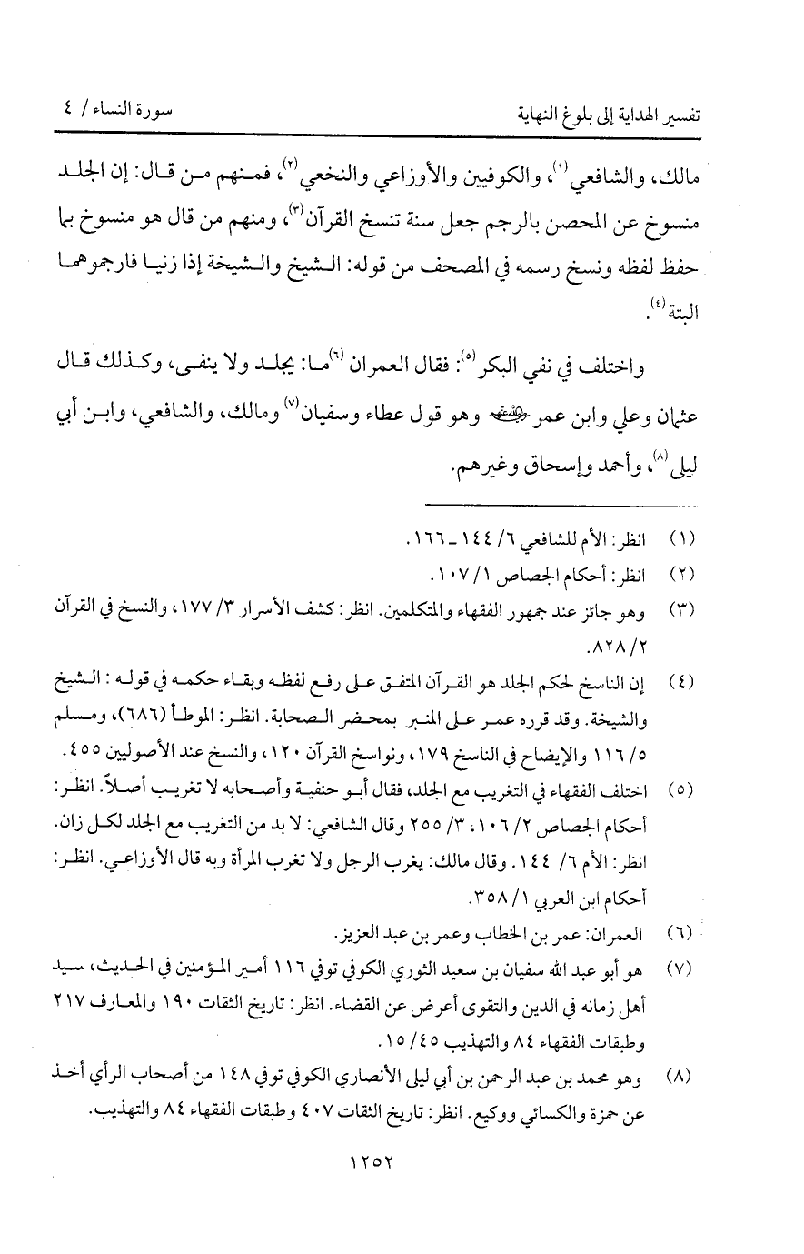 مالك، والشافعي، والكوفيين والأوزاعي والنخعي، فمنهم من قال: إن الجلد منسوخ عن المحصن بالرجم جعل سنة تنسخ القرآن، ومنهم من قال هو منسوخ بما حفظ لفظه ونسخ رسمه في المصحف من قوله: الشيخ والشيخة إذا زنيا فارجموهما البتة.