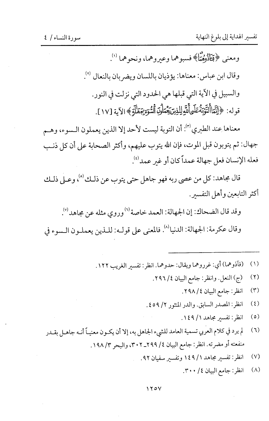 معناها عندها الطبري: أن التوبة ليست لأحد إلا الذين يعملون السوء، وهم جهال: ثم يتوبون قبل الموت، فإن الله يتوب عليهم، وأكثر الصحابة على أن كل ذنب فعله الإنسان فعل جهالة عمداً كان أو غير عمد.